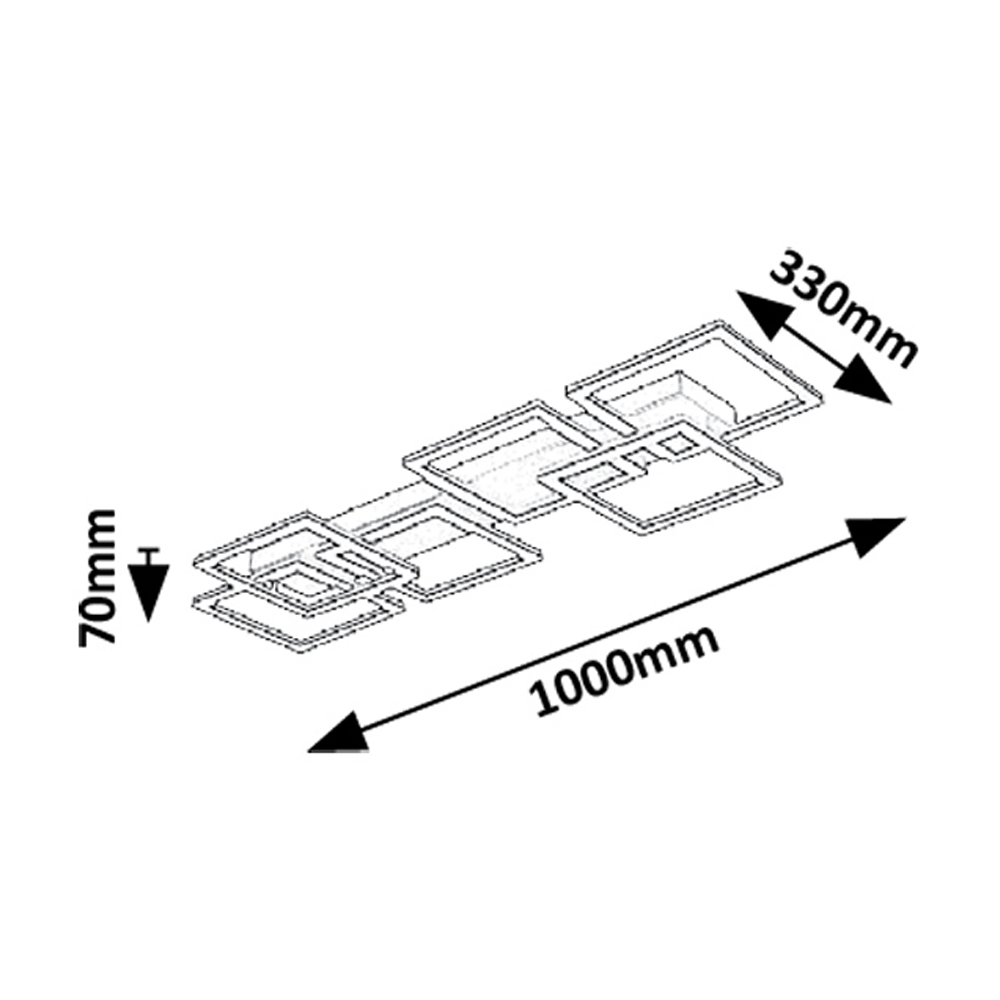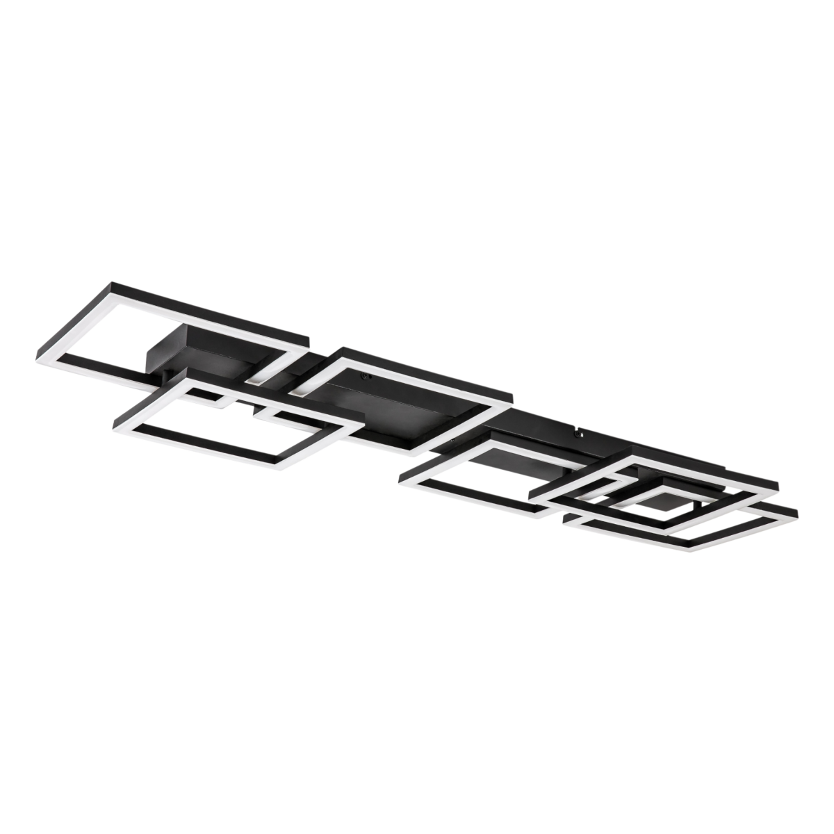 A fémből készült, fekete színű lámpatestet fehér műanyag búra egészíti ki, amely tiszta fényeloszlást biztosít. A modell különlegességét az egymást több ponton metsző, négyzet alakú elemek adják, amelyek karakteres, geometrikus megjelenést kölcsönöznek. A hosszú, szögletes dísztalp segítségével stabilan rögzíthető a mennyezetre.