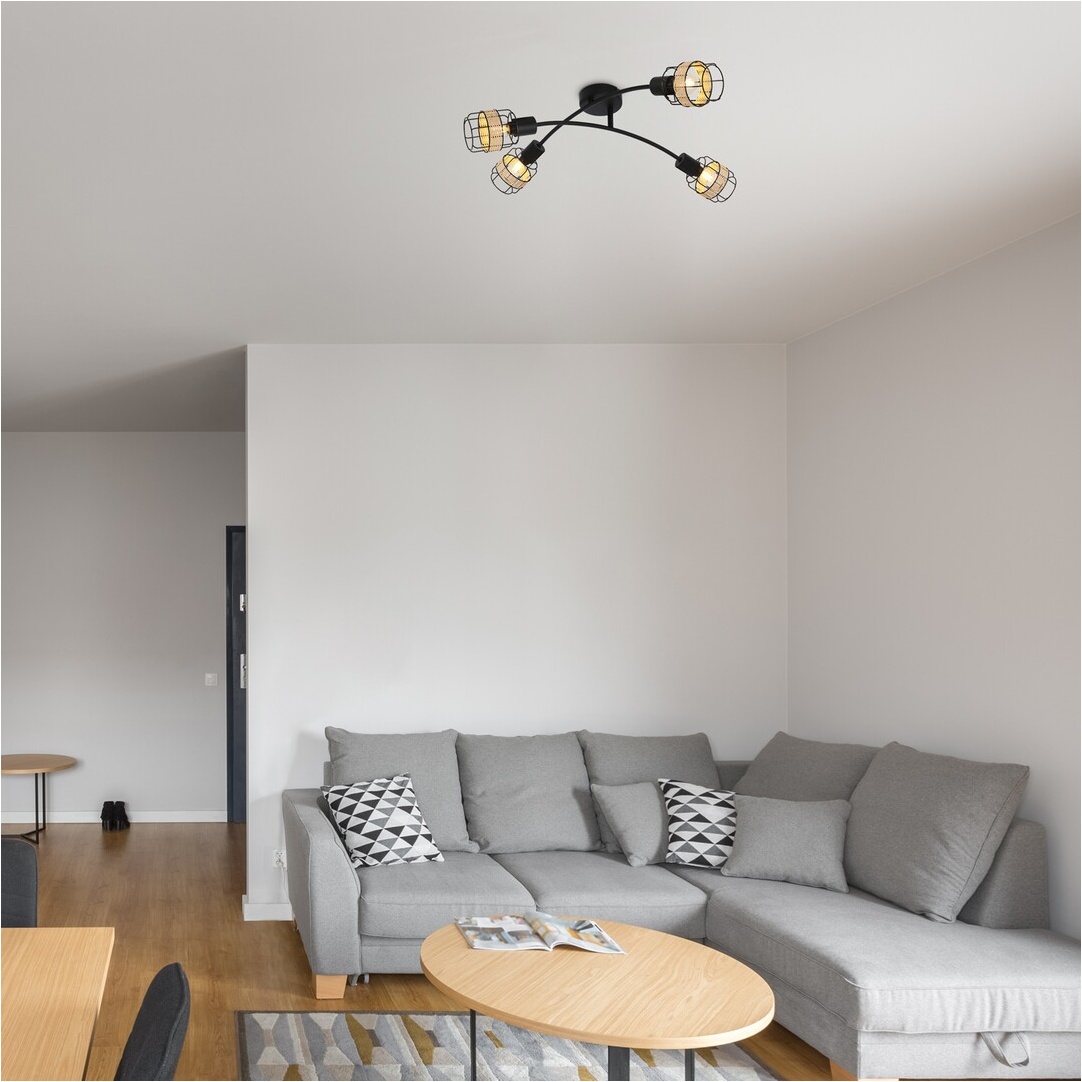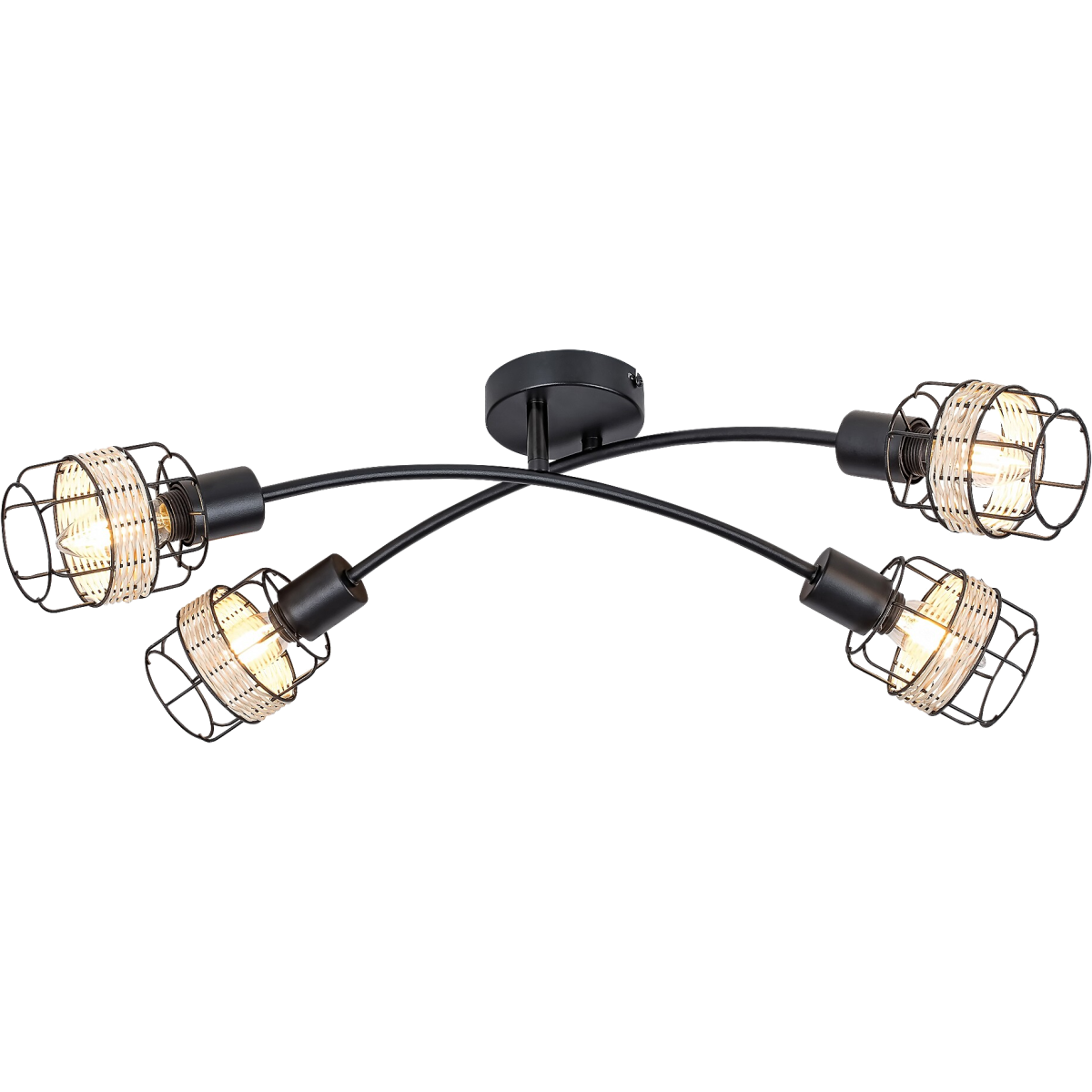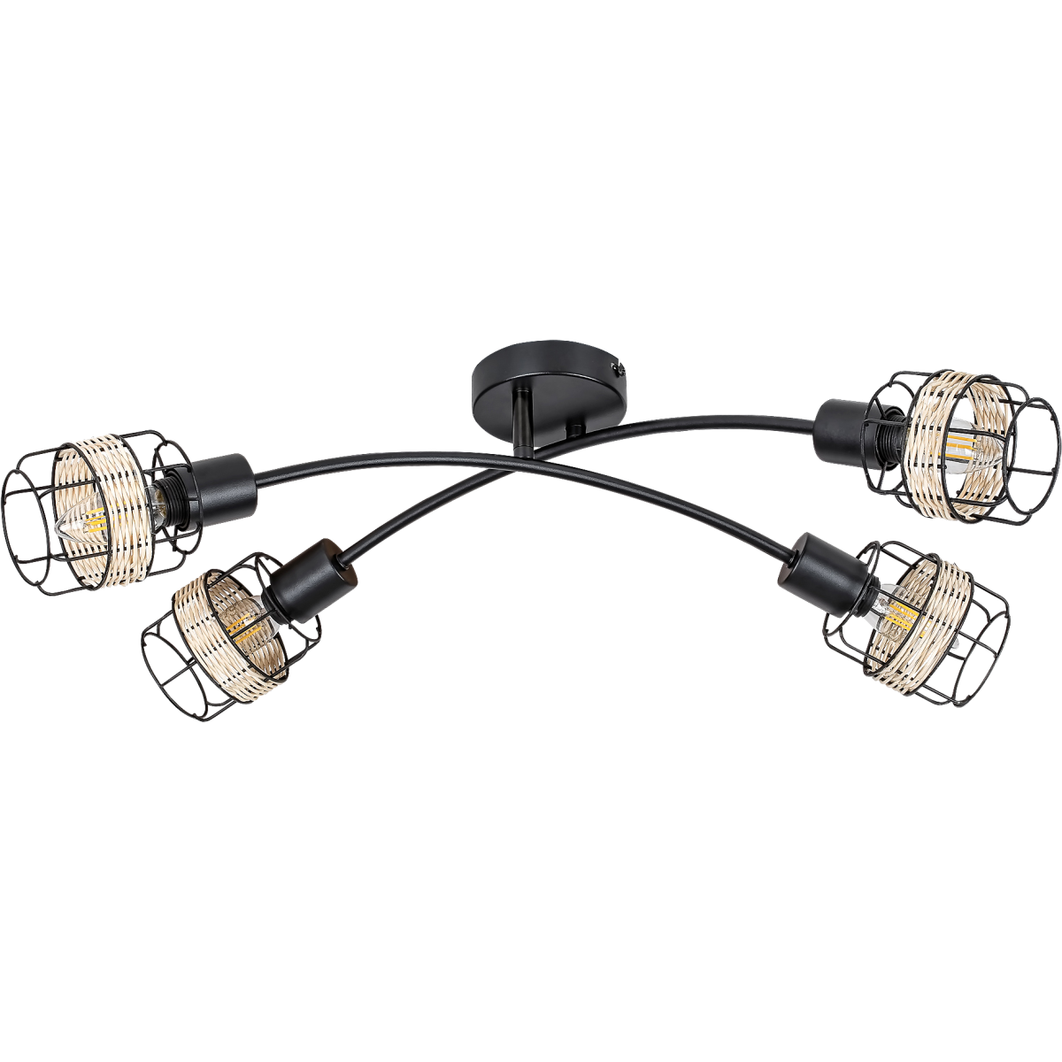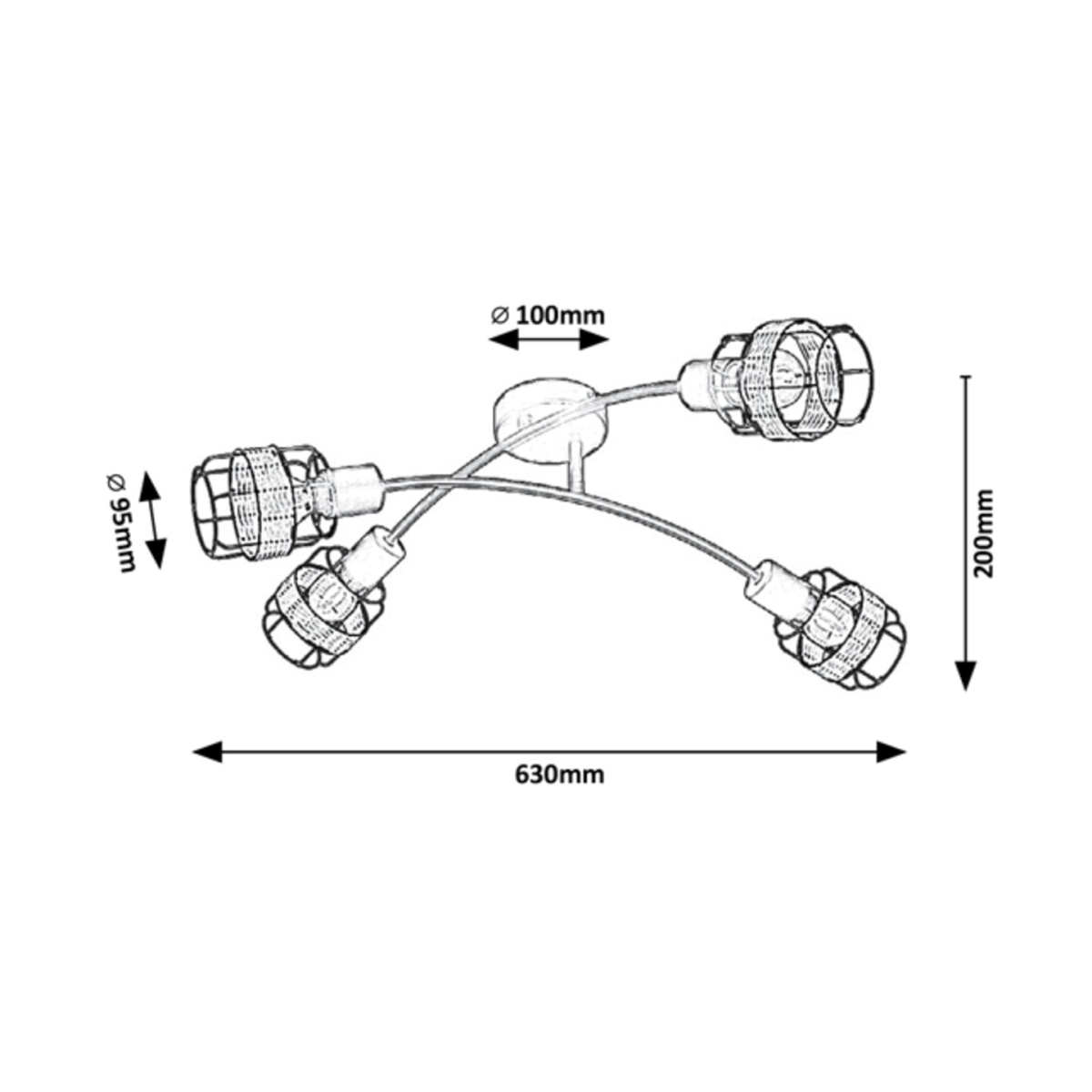 Az indusztriális stílusú Indiana négyes spotlámpa modern nappalink, hálószobánk, étkezőnk vagy konyhánk berendezésének stílusos darabja lehet. A fémből készült, matt fekete modellt rácsos búrák, valamint a búrákon körbefutó természetes, fonott dekoráció teszi teljessé. A két-két lámpafej a két egymást keresztező, forgatható tartórúd végein helyezkedik el, így a lámpa fénye tetszés szerint irányítható a helyiségben. Az Indiana kisméretű, kerek dísztalp segítségével rögzíthető a mennyezetre. A spot lámpa négy darab, egyenként legfeljebb 25 W teljesítményű fényforrással használható, a foglalatok típusa E14. Ha a meghitt, otthonos hangulatot szeretnénk erősíteni, válasszunk ehhez a modellhez meleg fehér fényű fényforrásokat. Az Indiana négyes spotlámpa méretei a következők: szélessége 630 mm, egy-egy búra átmérője 95 mm, a lámpa mennyezettől mért távolsága 200 mm.