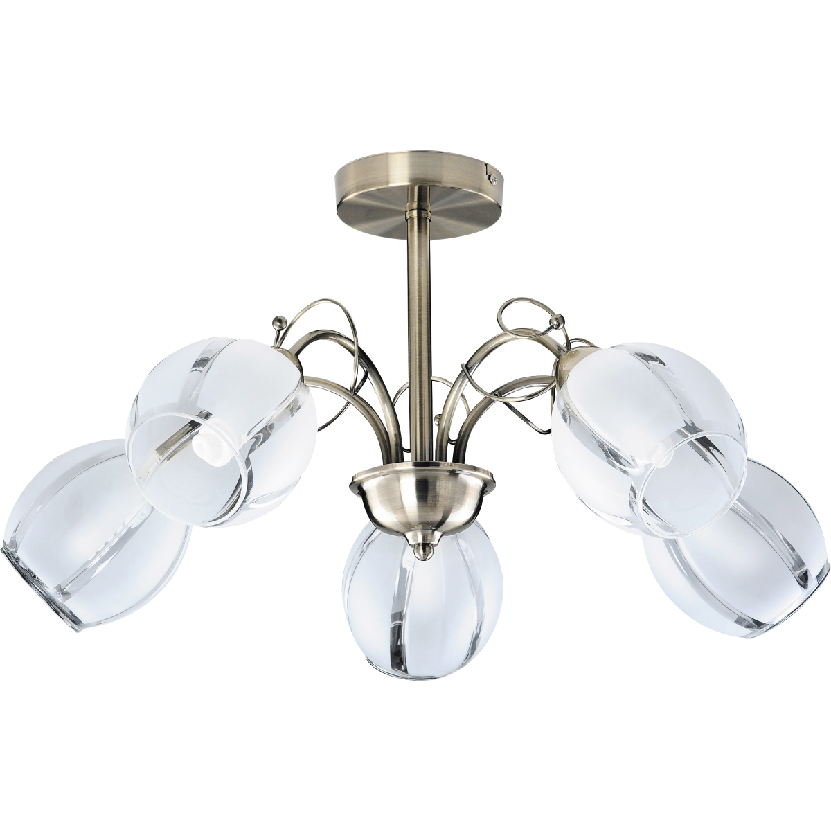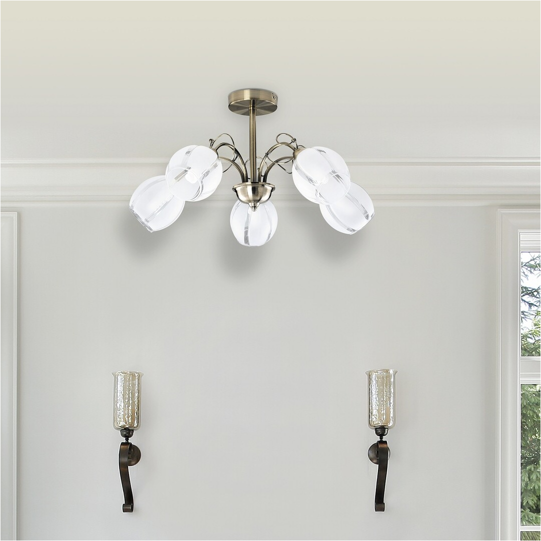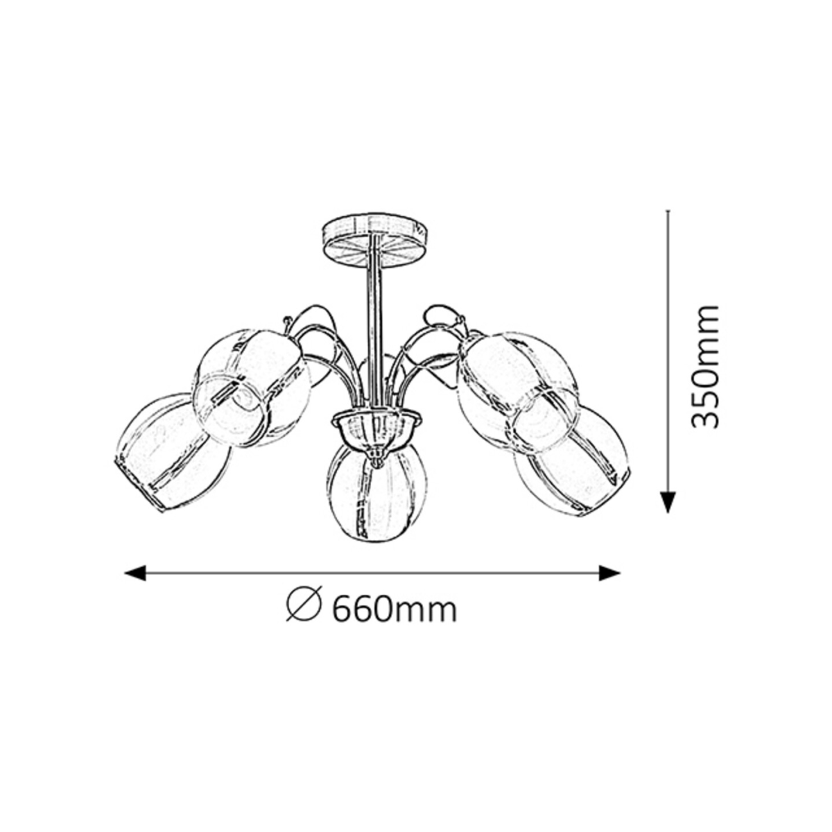 Klasszikus megjelenésű mennyezeti lámpa 5 db foglalattal. 35 cm lenyúlású, 66 cm átmérőjű, bronz színű, fém test, üveg lámpabúrákkal. A lámpatest E27-es foglalat kialakítású, maximum 5x60W teljesítményű fényforrásokkal használható.