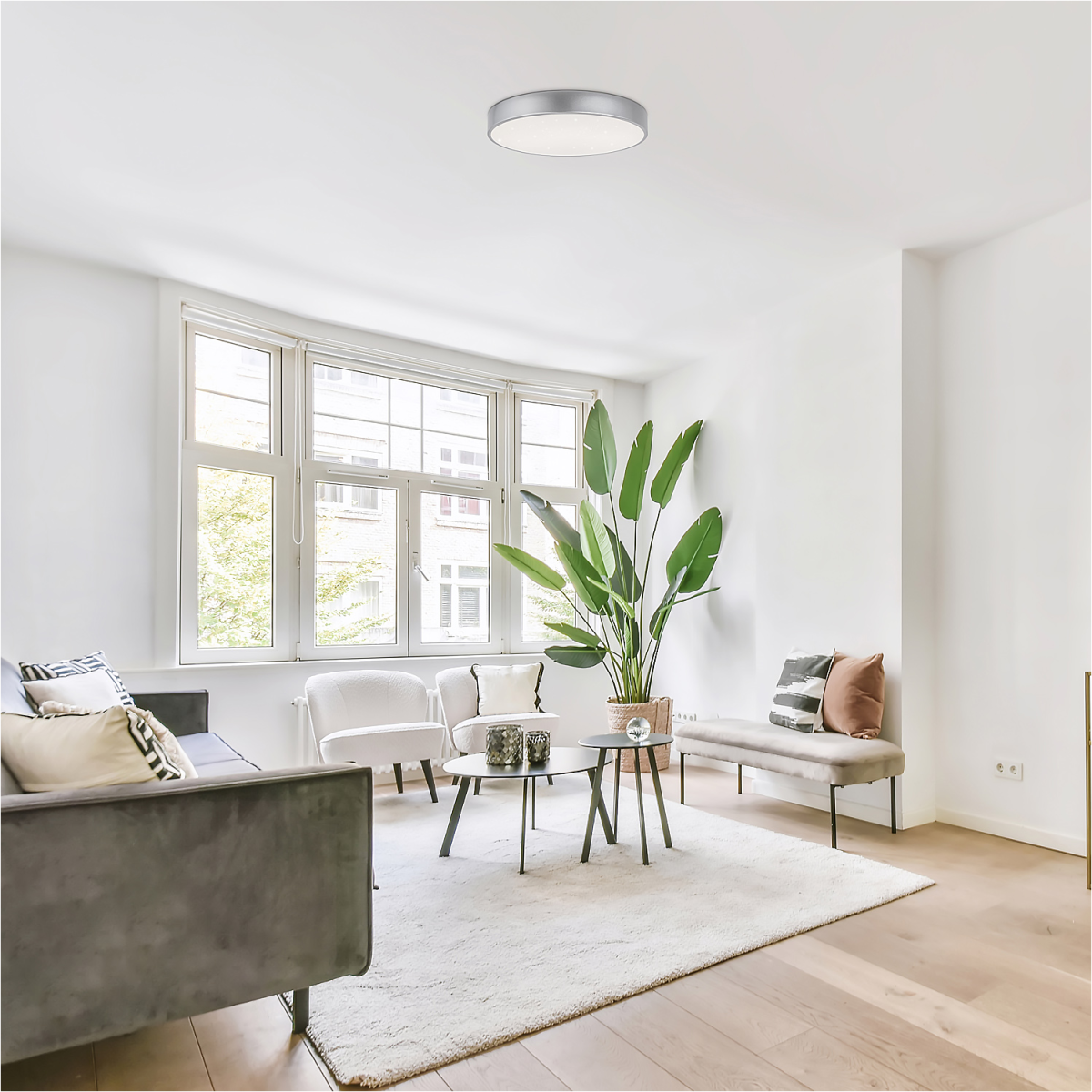 A csillogó effekttel ellátott, kerek Octav mennyezeti lámpa szinte bármely modern nappali, hálószoba vagy dolgozószobába berendezésének praktikus darabja lehet. Az ezüstszínű, fém lámpatestet fehér műanyagbúra egészíti ki.