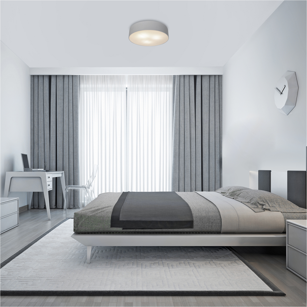 A kerek Renata mennyezeti lámpa modern stílusával nappalink vagy hálószobánk berendezésének egyszerű, praktikus darabja lehet. A fémből készült, matt fehér lámpatestet fehér akrilbúra egészíti ki. A Renata három darab, egyenként legfeljebb 10 W teljesítményű fényforrással használható, a foglalatok típusa E27. Attól függően, hogy melyik helyiségben szereljük fel a lámpát, és milyen hatást szeretnénk elérni, választhatunk hozzá meleg vagy természetes fehér fényű fényforrásokat. A mennyezeti lámpa méretei a következők: átmérője 450 mm, mennyezettől való távolsága 100 mm. Ezt a modellt fényforrások nélkül szállítjuk.