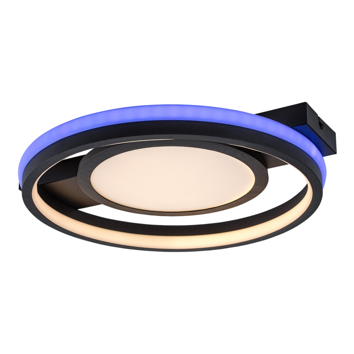 A Rábalux Shirin mennyezeti lámpa elegáns fekete színben, fehér műanyag búrával készült, modern formavilága pedig könnyen illeszkedik bármely enteriőrbe. Különlegességét a körkörös RGB világítás adja, amely a lámpatest peremén fut végig, hangulatos színes fényt kínálva. Ez a rész külön is vezérelhető, így egyszerre használható általános világításként és dekoratív kiegészítő fényként.