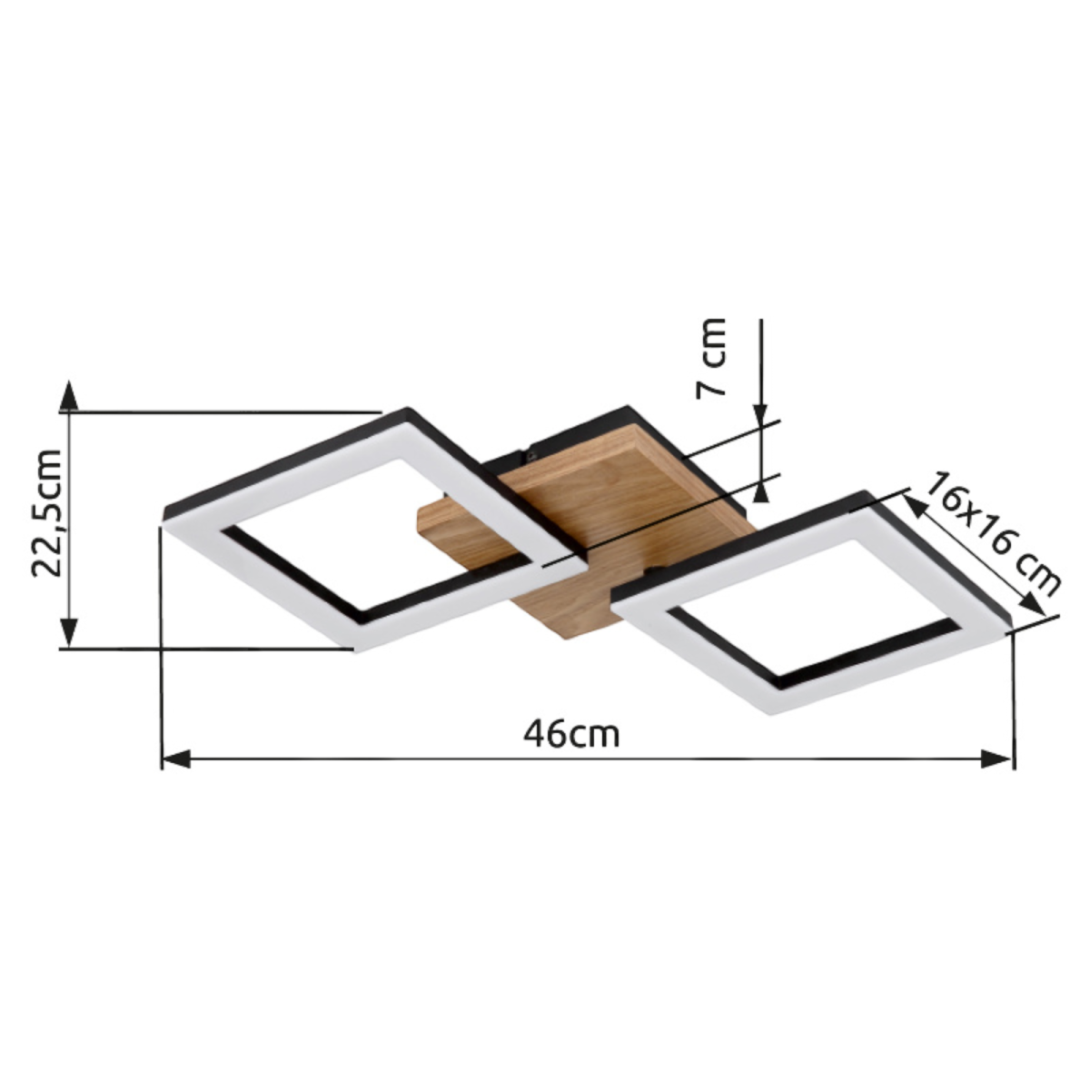 A KERRY család modern mennyezeti lámpa nagyszerű dizájnnal rendelkezik, és magához vonzva a tekintetet a helyiség középpontjává válik. A fa megjelenésű mennyezeti konzolon két négyzet alakú LED panel található, amelyek 3000 Kelvin meleg fehér fénnyel ragyognak, és így csodálatos hangulatot teremtenek.
