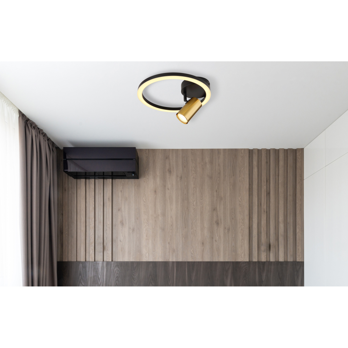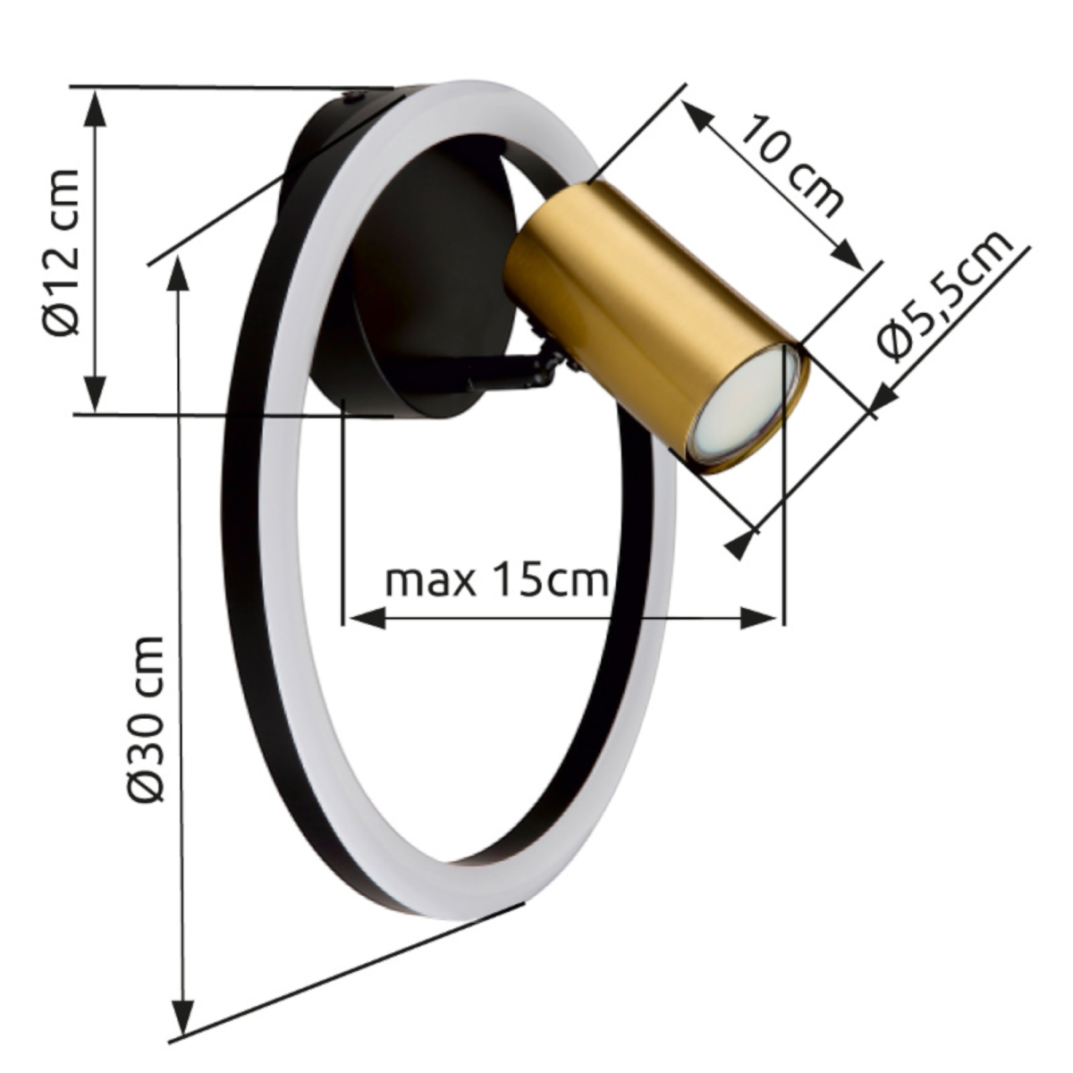 Tedd egyedivé otthonodat ezzel a ragyogó termékkel! A MARRIE LED modern fali lámpája nagyszerű kialakításával megragadja a figyelmet. A fekete fali lámpatestből egy sárgaréz színű GU10-es spotlámpa foglalat, és egy kerek LED panel (Ø30 cm) emelkedik ki, amely 3000 Kelvin meleg fehér fényt bocsát ki, így kellemes hangulatot teremt. A termékhez 1db GU10-es foglalatú, maximum 5W-os irányított fényű LED ajánlott, amit a termék nem tartalmaz.