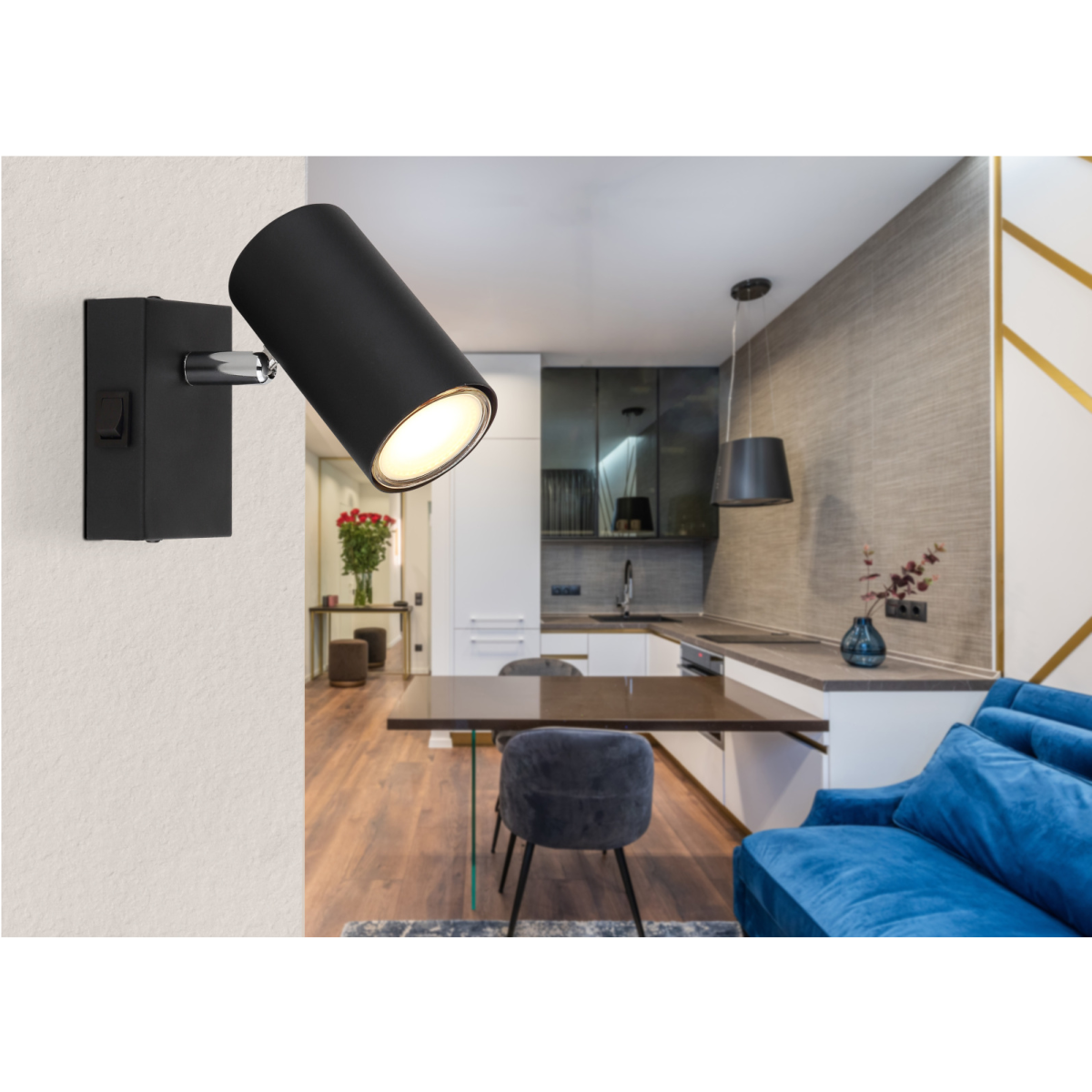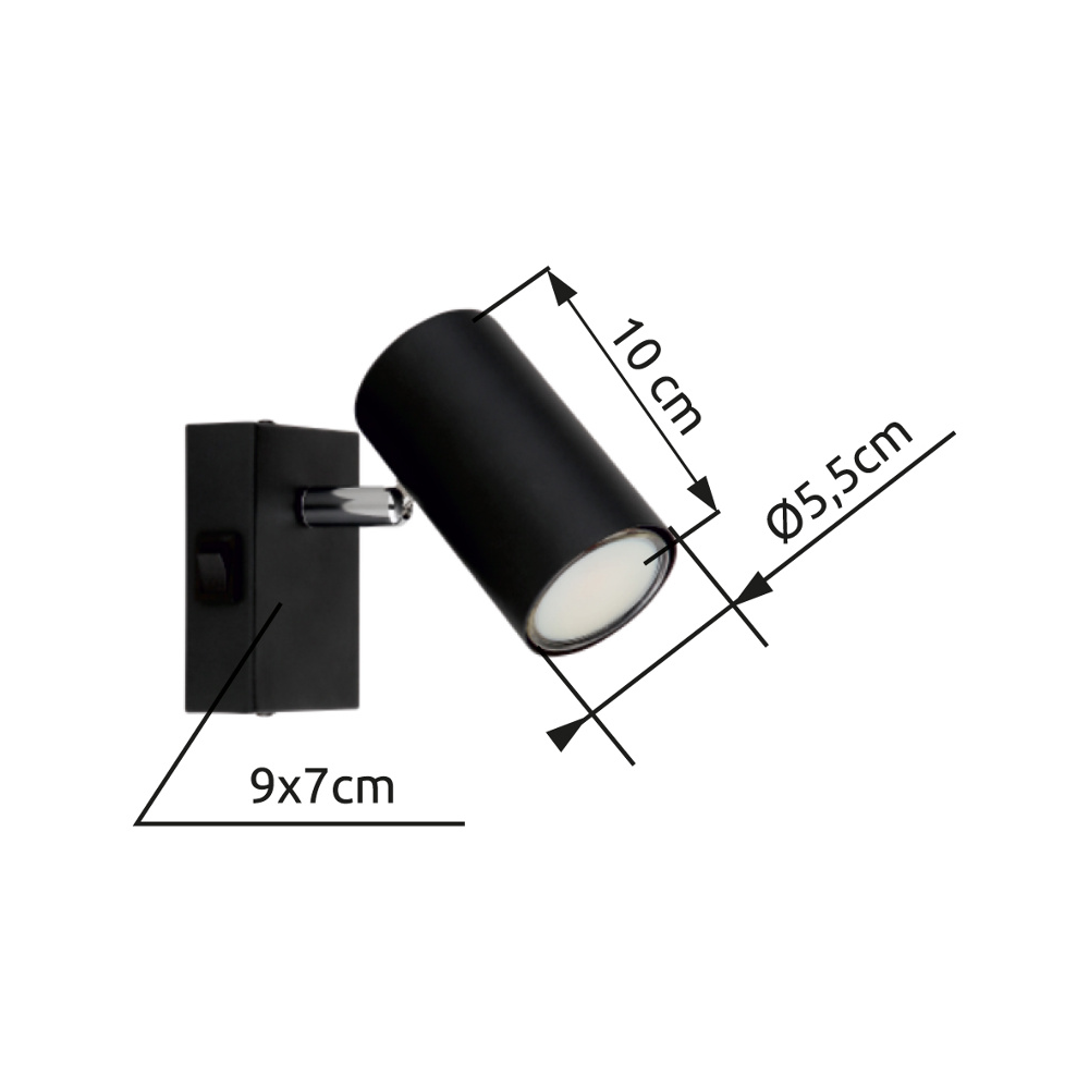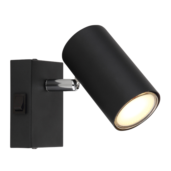 Spotlámpa fém, krómozott, matt fekete színben, billenőkapcsolóval ellátva, amely megkönnyíti a használatot. A lámpa GU10 foglalattal rendelkezik, mely maximum 25W teljesítményű fényforrással üzemeltethető. A spotlámpát a modern külső és a praktikus kivitelezés jellemzi, így igen sokféle helyiségbe illik ez az izgalmas lámpa, modern vagy klasszikus enteriőrbe egyaránt illeszkedik.