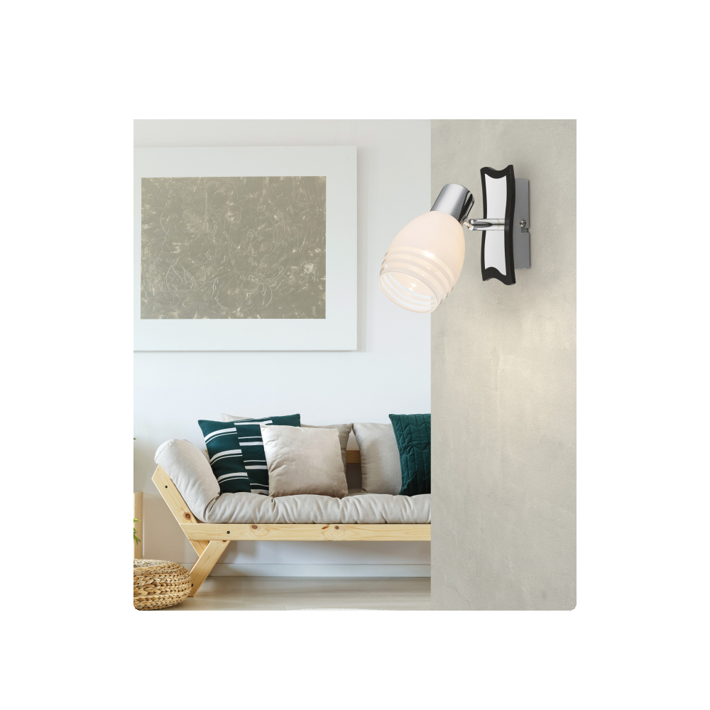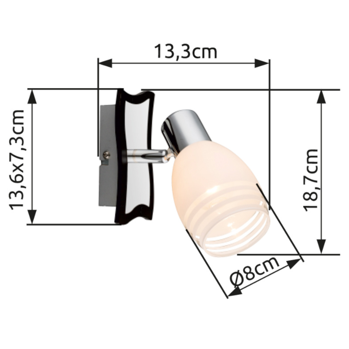 A lámpa talprésze igazán különleges MDF wenge színű bútorlap és króm elegye. Ehhez egy fehér üvegbúra tartozik, melynek a mintája 3 átlátszó csík amitől megkapja finom eleganciáját. A fej a csuklópontnál állítható.