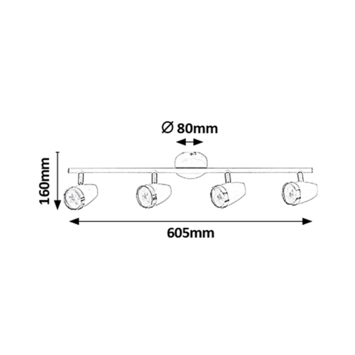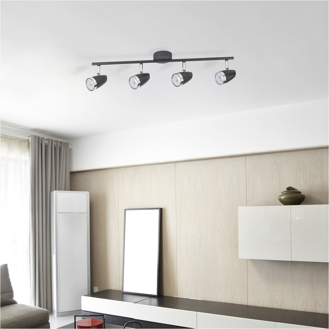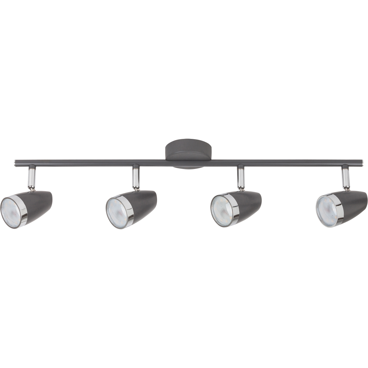 Modern megjelenésű mennyezeti spotlámpa, 4 db beépített energiatakarékos LED fényforrással. 60,5 cm széles, antracit szürke és króm színű, fémből és műanyagból készített lámpatest pozícionálható lámpabúrákkal. A beépített LED-es lámpa teljesítménye 4x4 W, melyhez 4x280 lumen fényerő társul. Színhőmérséklete melegfehér (3000 Kelvin).
