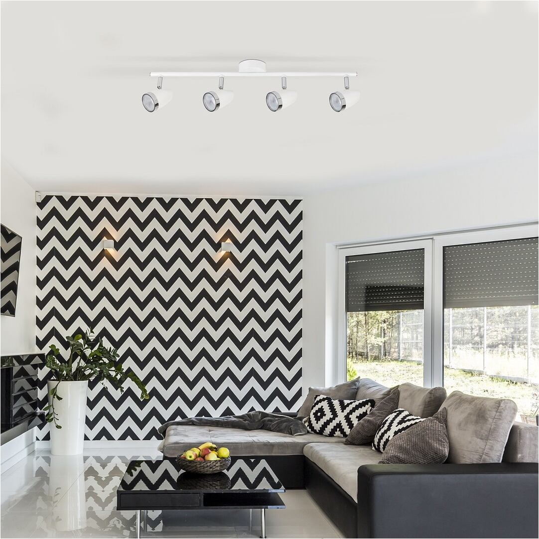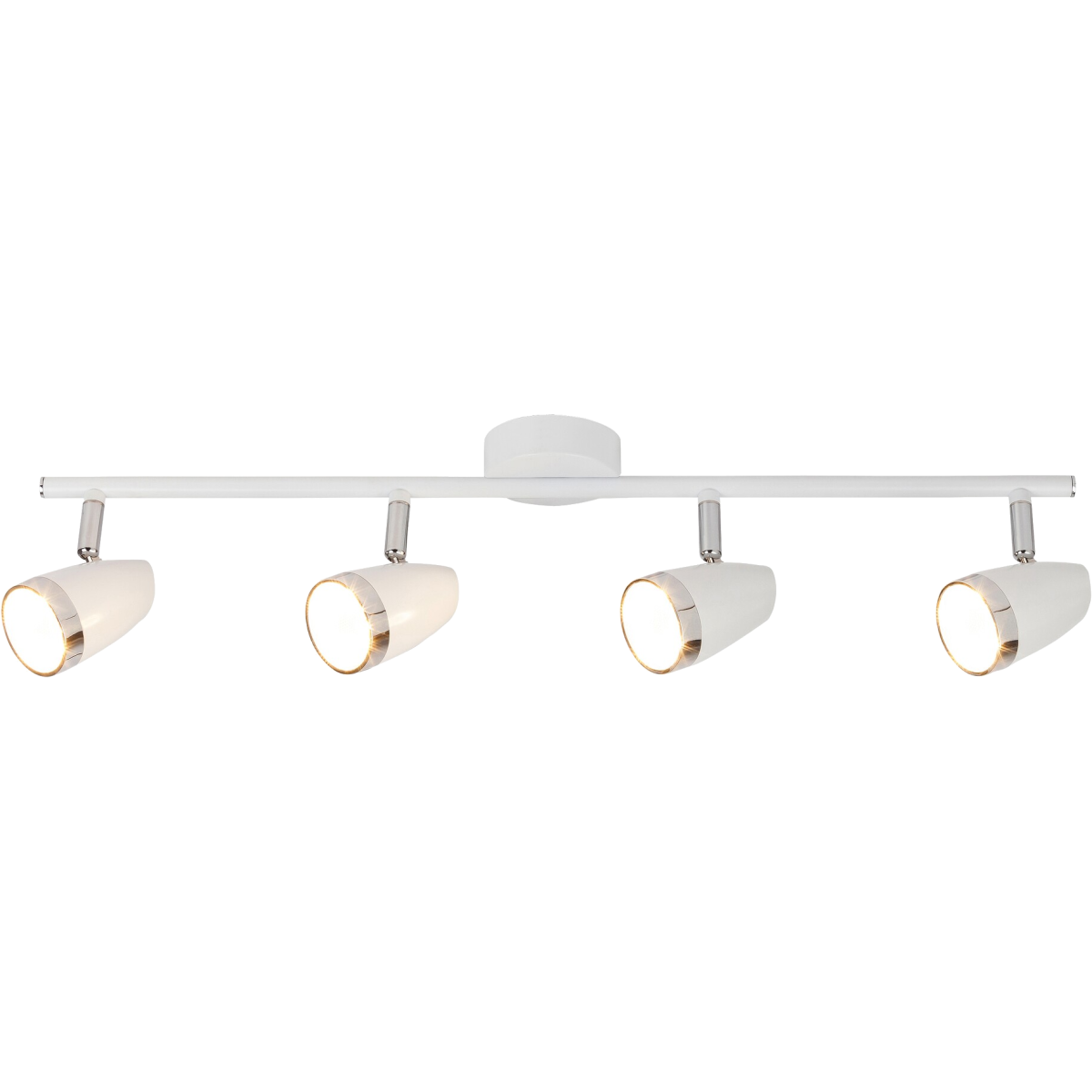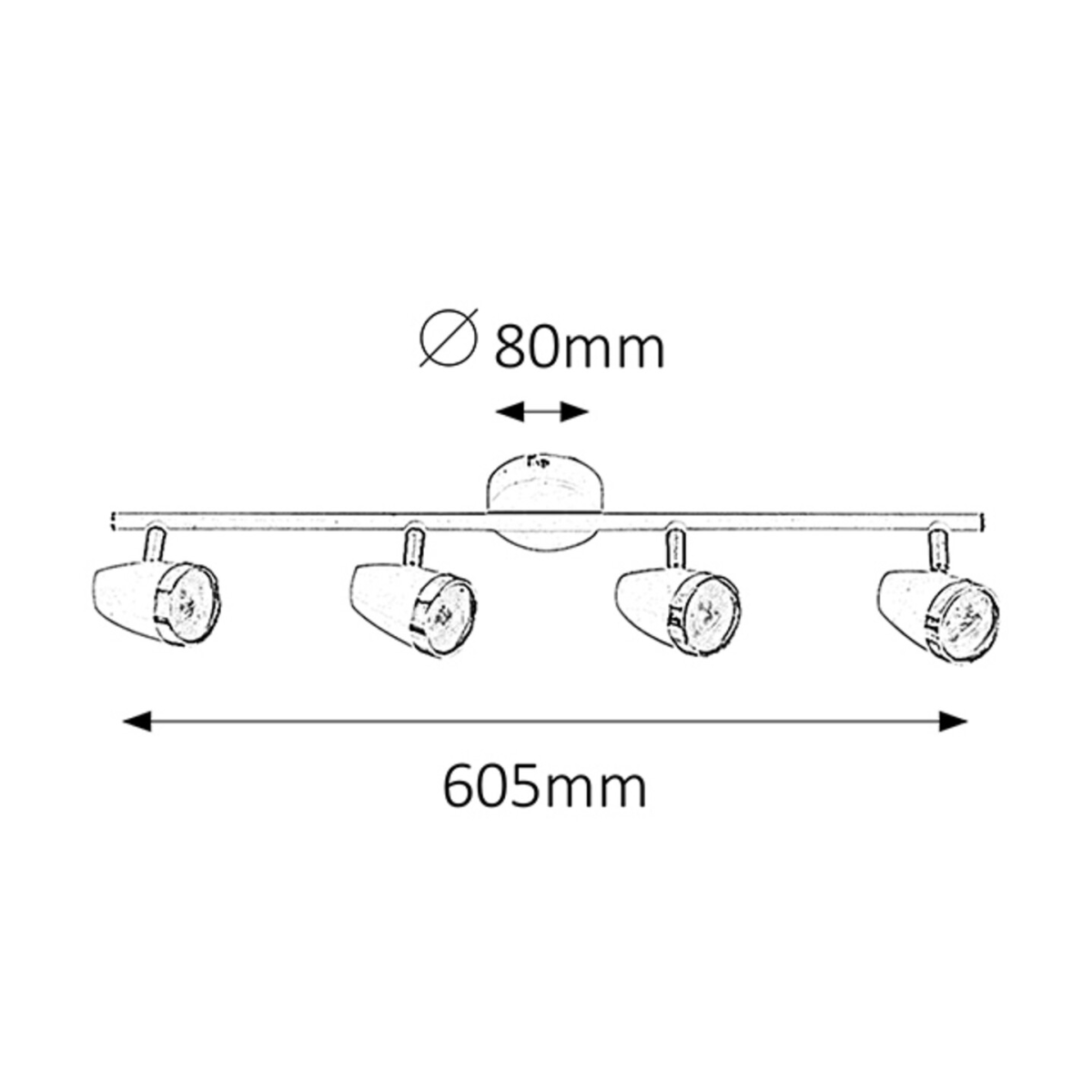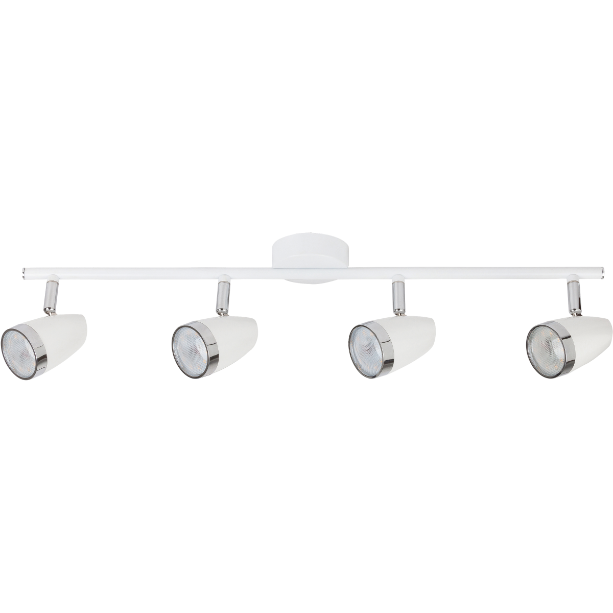 Modern megjelenésű mennyezeti spotlámpa, 4 db beépített energiatakarékos LED fényforrással. 60,5 cm széles, fehér és króm színű, fémből és műanyagból készített lámpatest pozícionálható lámpabúrákkal. A beépített LED-es lámpa teljesítménye 4x4 W, melyhez 4x280 lumen fényerő társul. Színhőmérséklete melegfehér (3000 Kelvin).
