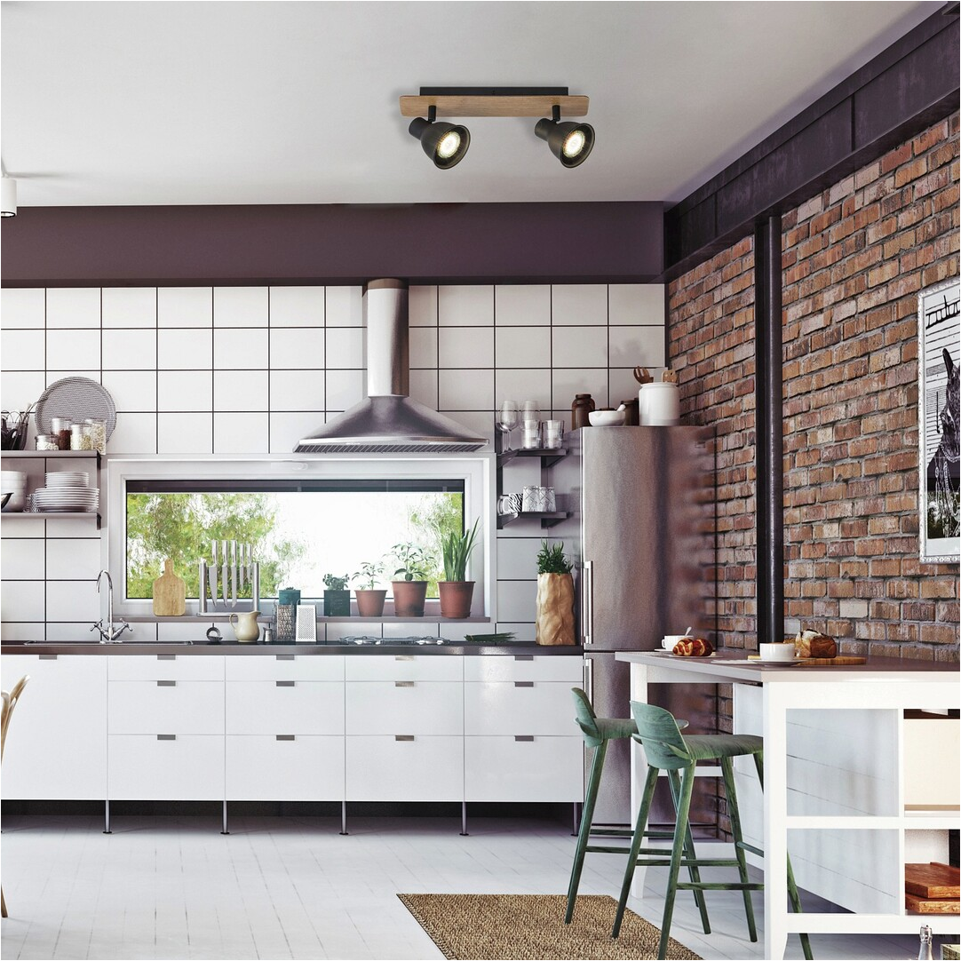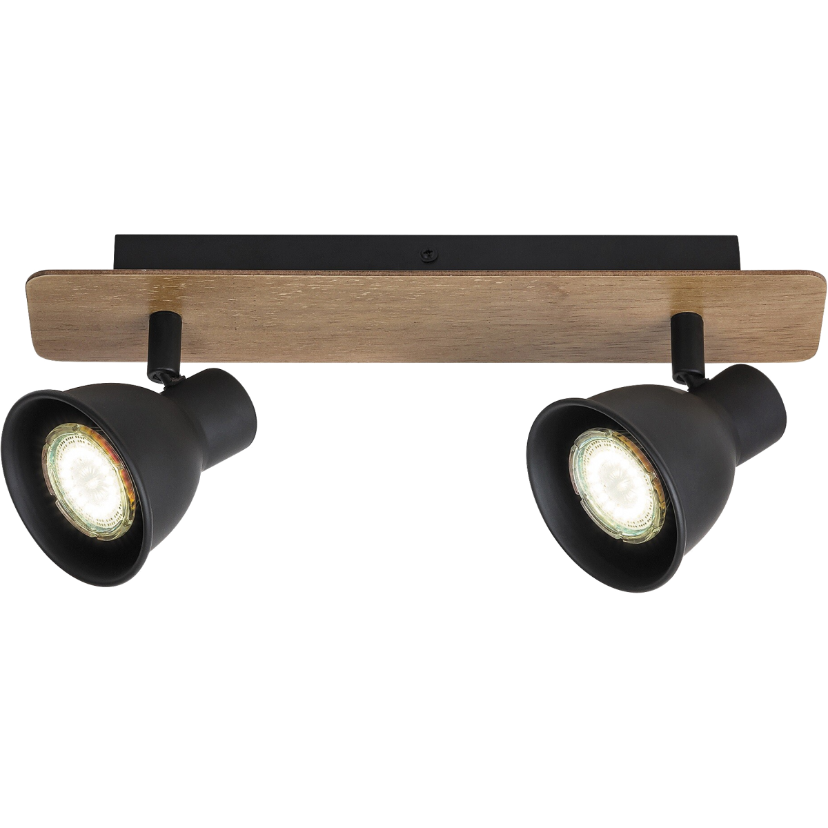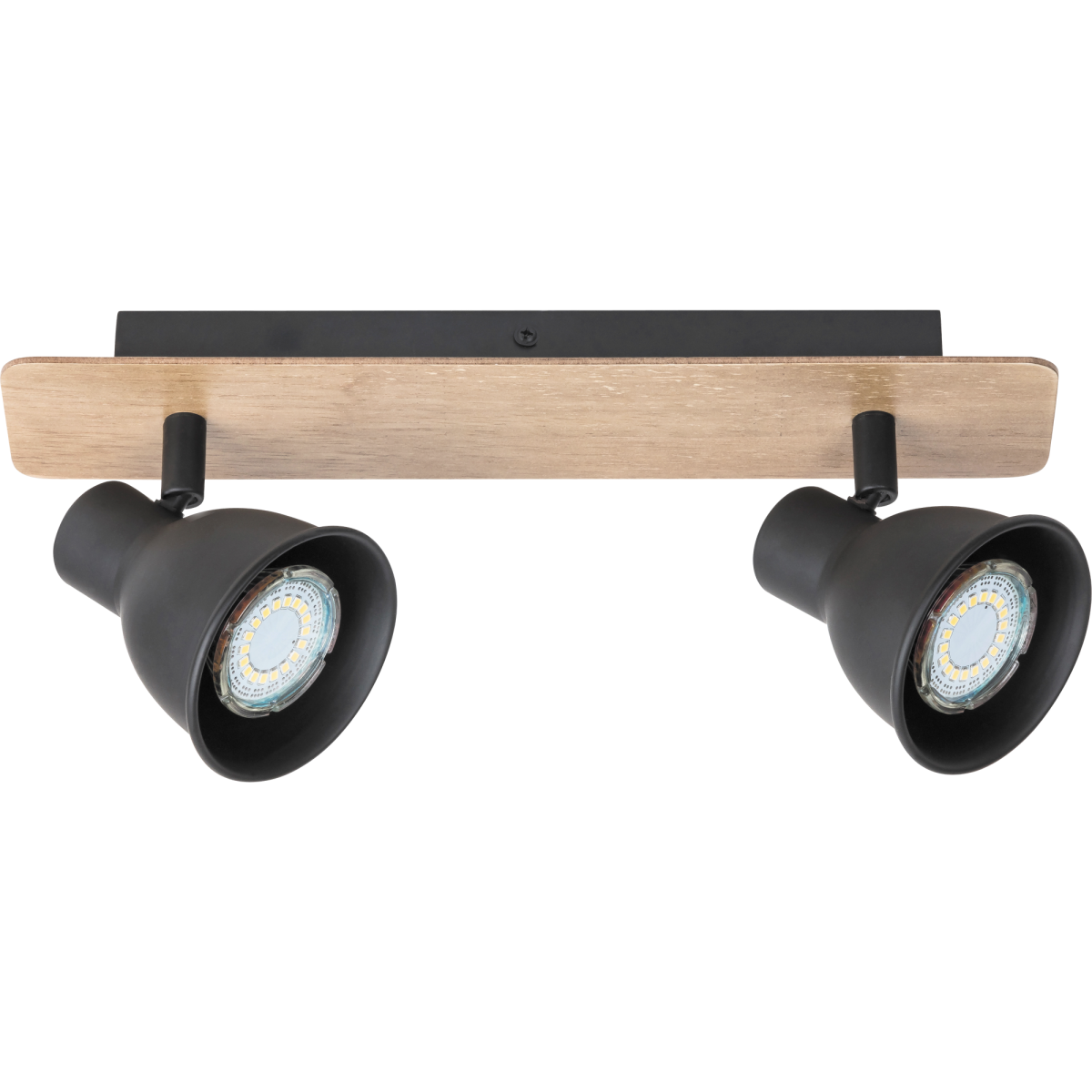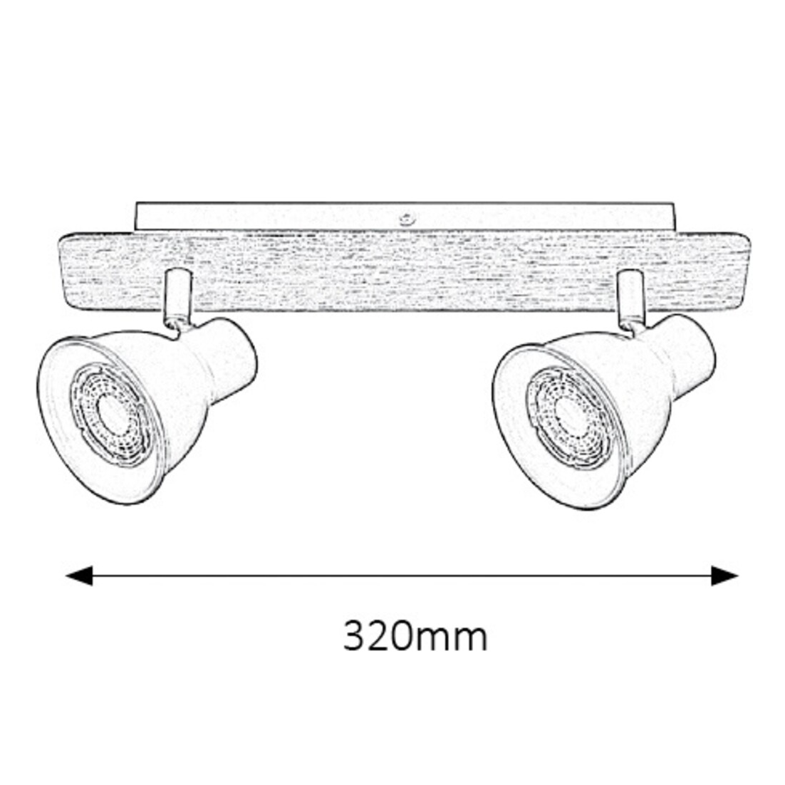 Indusztriális stílusú fali spotlámpa 2 db foglalattal. 32 cm széles, fekete színű és fa hatású, bükk színű fémből készített szerkezet. Pozícionálható lámpabúrákkal, IP20-as védettséggel. A lámpatest GU10-es foglalatkialakítású, 2x maximum 15W-os teljesítményű, csak energiatakarékos izzókkal használható.