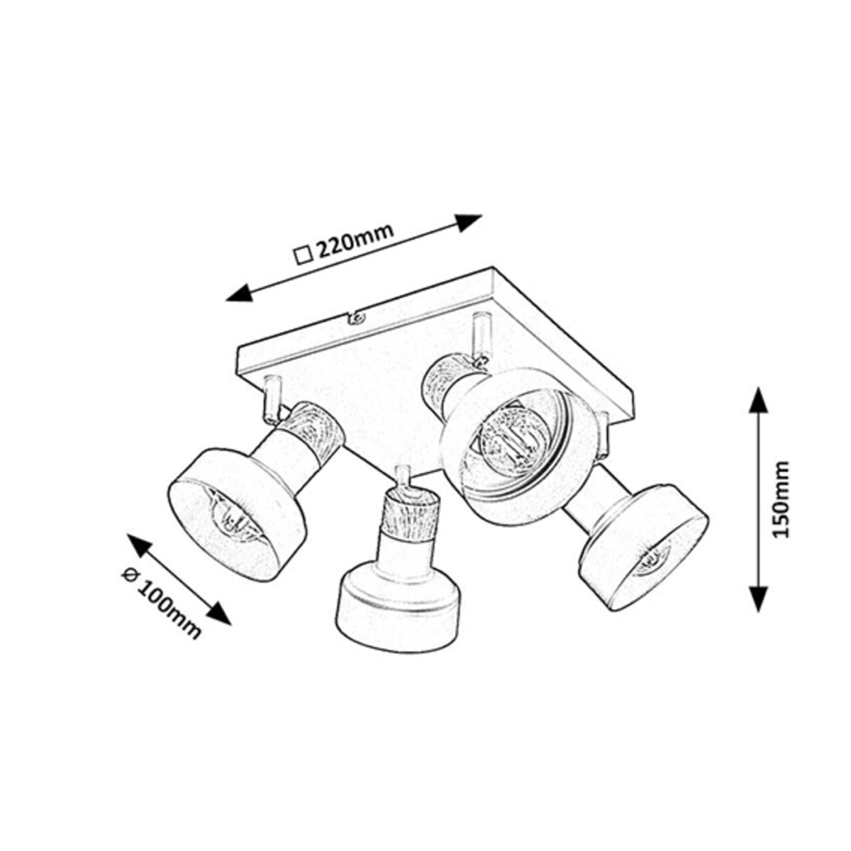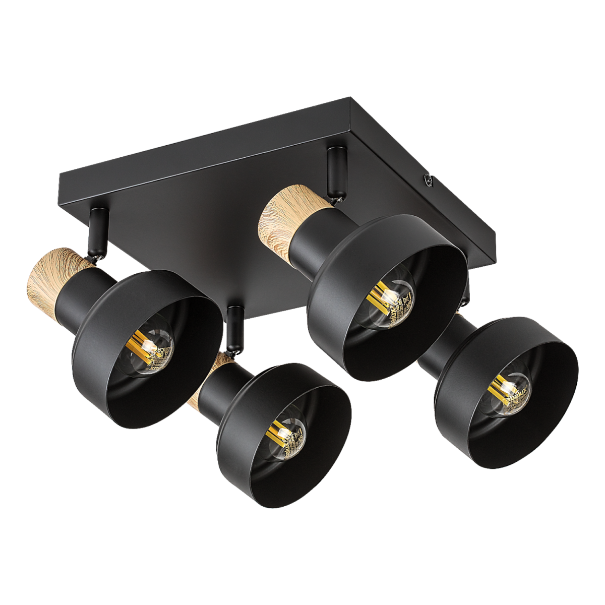 A Rábalux Saskia négyes mennyezeti spotlámpa a skandináv stílus eleganciáját ötvözi a praktikus funkcionalitással. A fekete fém testet a tölgy színű fa betétek teszik természetközelivé, míg a búrák belső arany színe meleg fényhatást eredményez. A négyzet alakú dísztalp stabil rögzítést biztosít, a négy forgatható lámpafej pedig lehetővé teszi, hogy a fényt pontosan oda irányítsd, ahol szükség van rá.