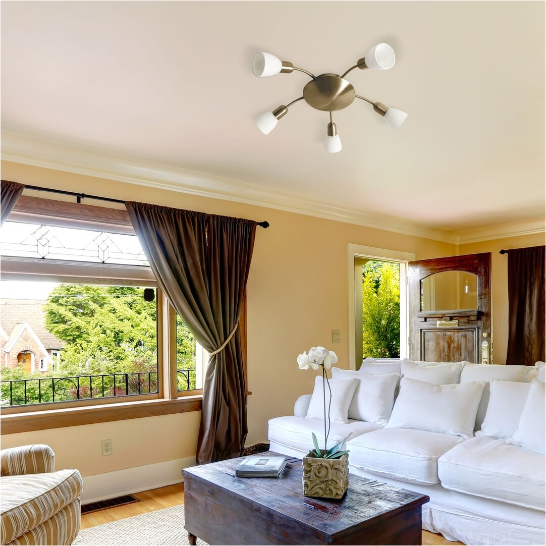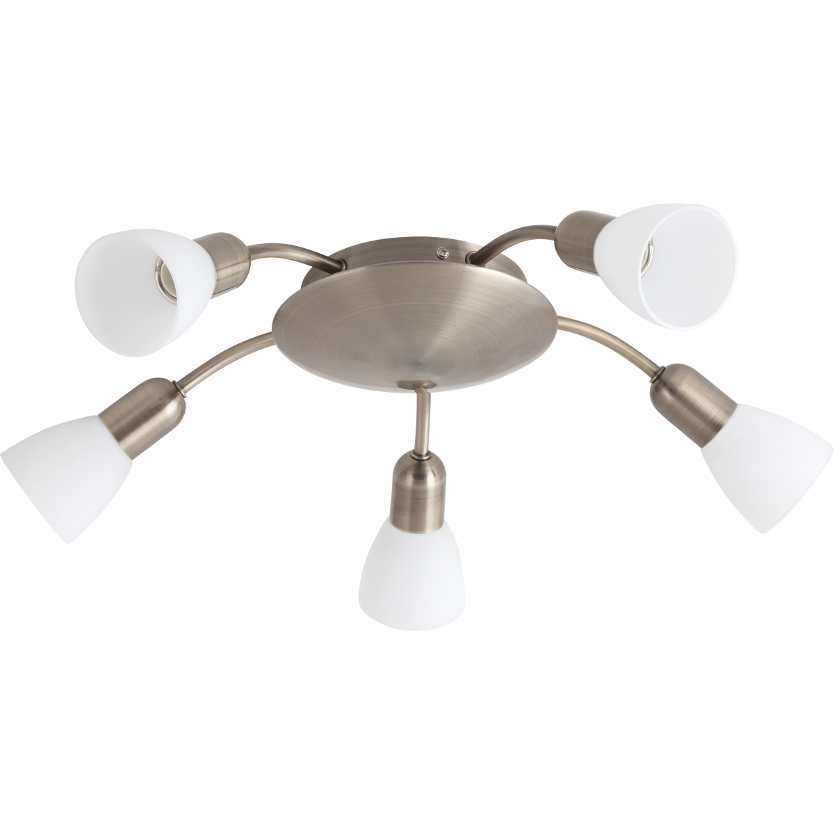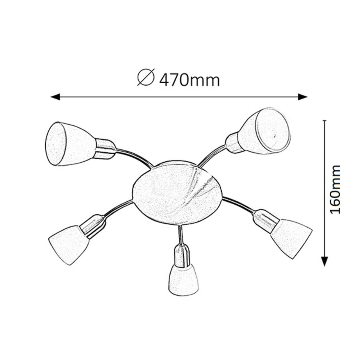Időtlen stílusú mennyezeti lámpa, 5 db foglalattal. 47 cm átmérőjű, bronz színű fém szerkezet és pozícionálható, fehér színű üveg burák, IP20-as védelemmel. A lámpatest E-14-es foglalatú, maximum 5x40W teljesítményű fényforrásokkal működtethető.