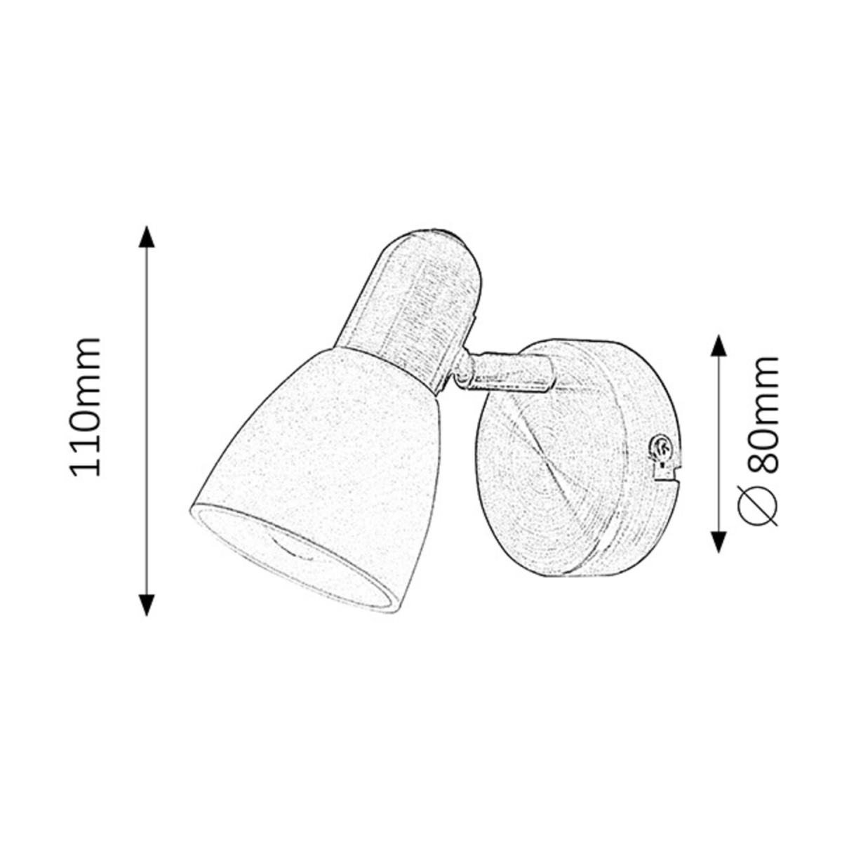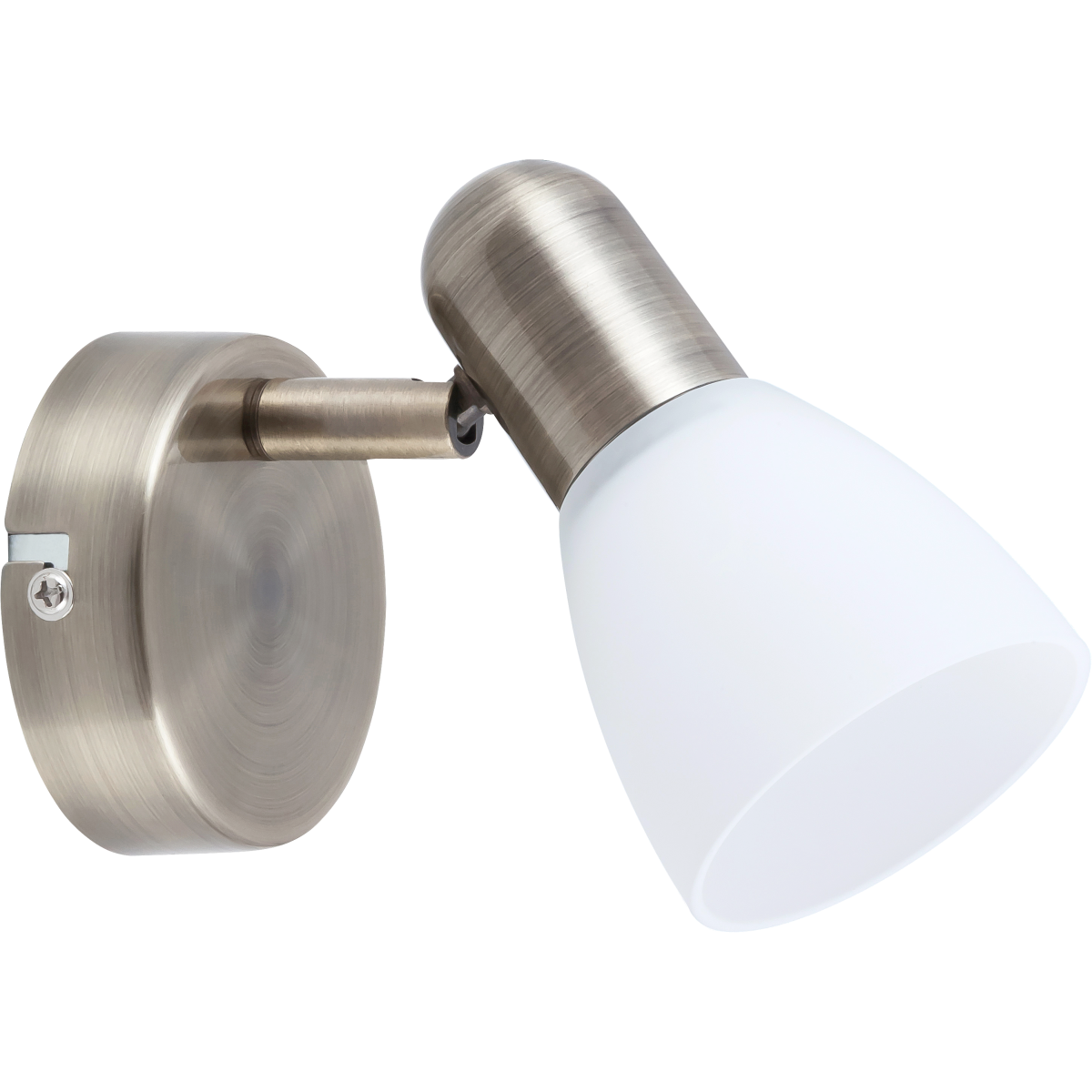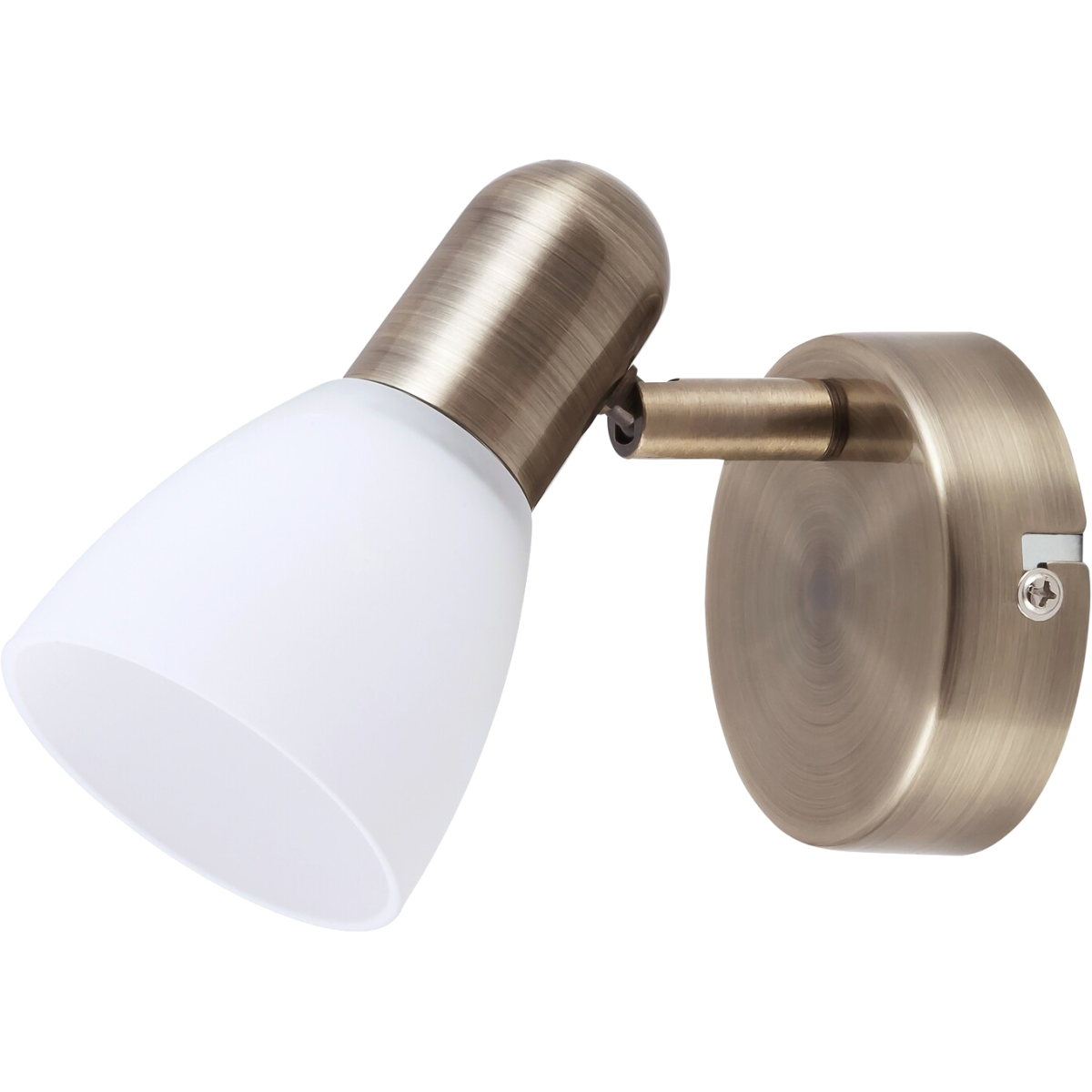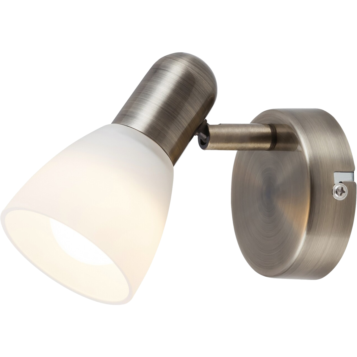 Időtlen stílusú spotlámpa, 1 darab foglalattal. 11 cm magas, bronz színű fém szerkezet és pozícionálható, fehér színű üvegbúra, IP20-as védelemmel. A lámpatest E14-es foglalatú, maximum 40W teljesítményű fényforrással használható.
