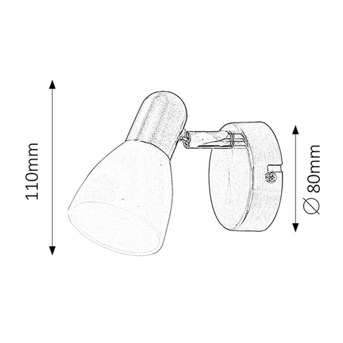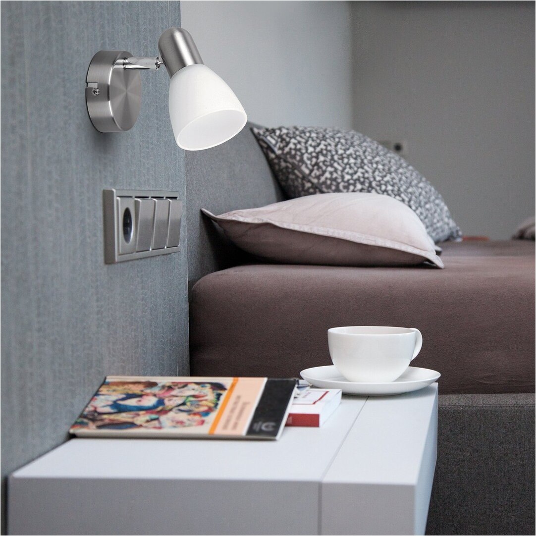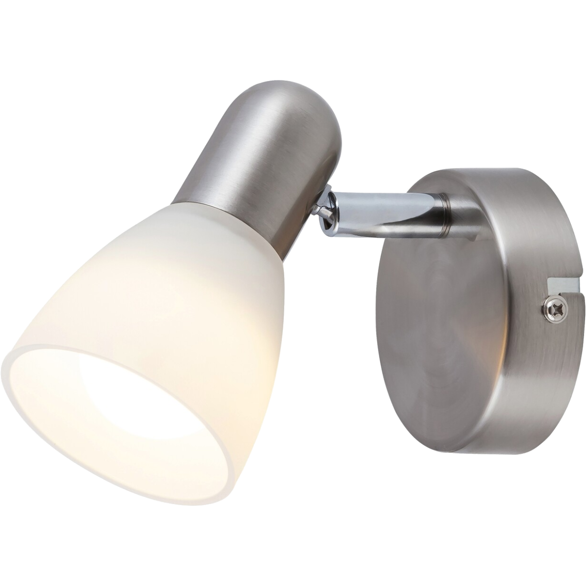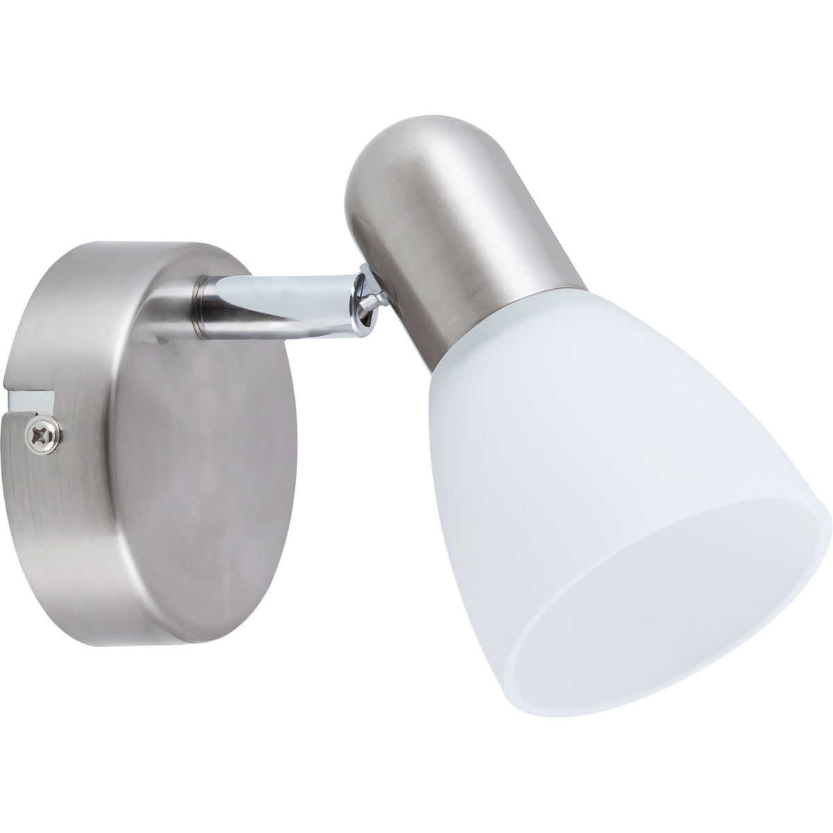 Időtlen stílusú spotlámpa, 1 darab foglalattal. 11 cm magas, szatin króm színű fém szerkezet és pozícionálható, fehér színű üvegbura, IP20-as védelemmel. A lámpatest E14-es foglalatú, maximum 40W teljesítményű fényforrással használható.