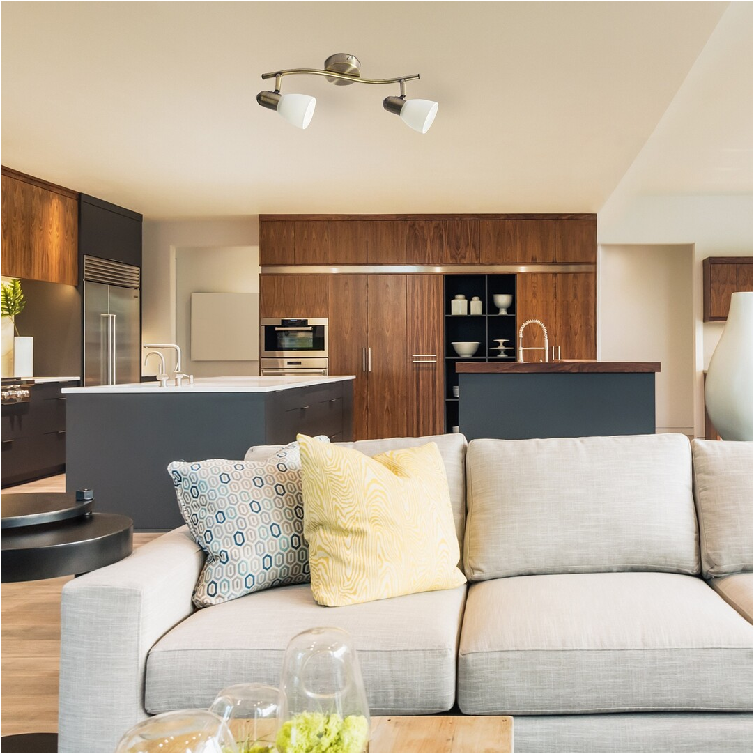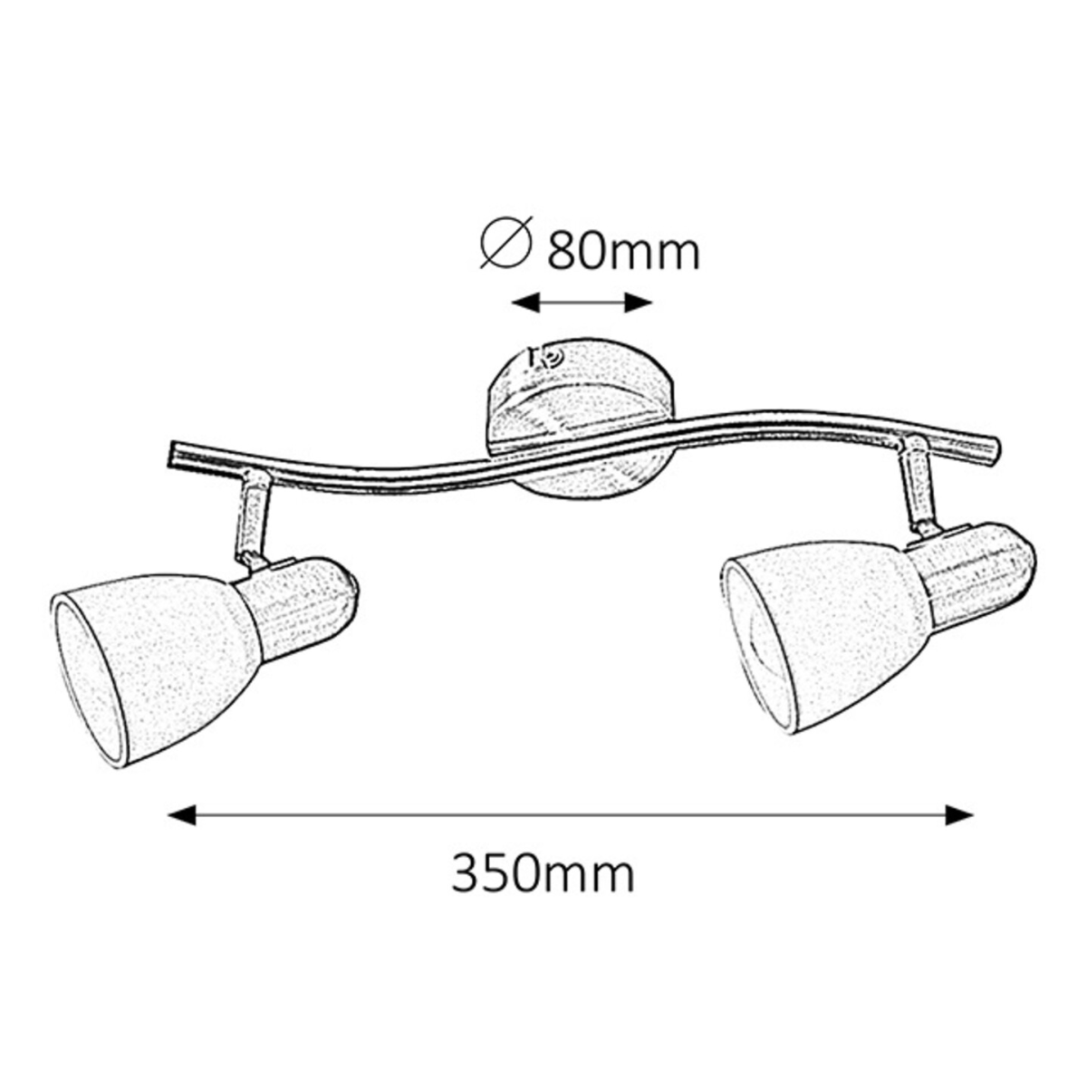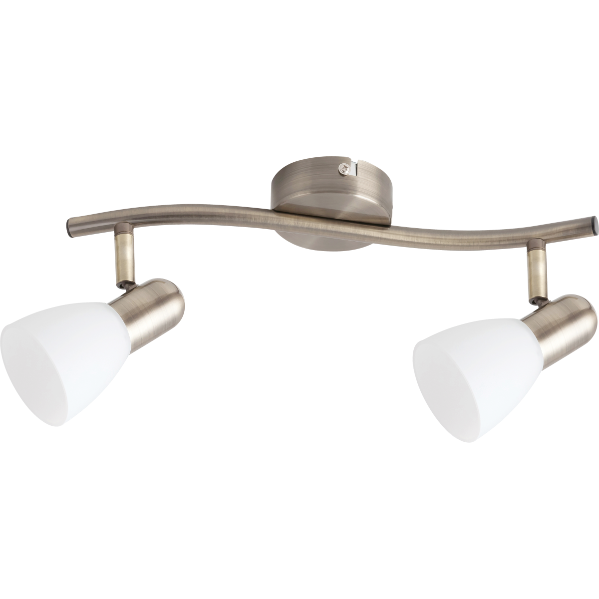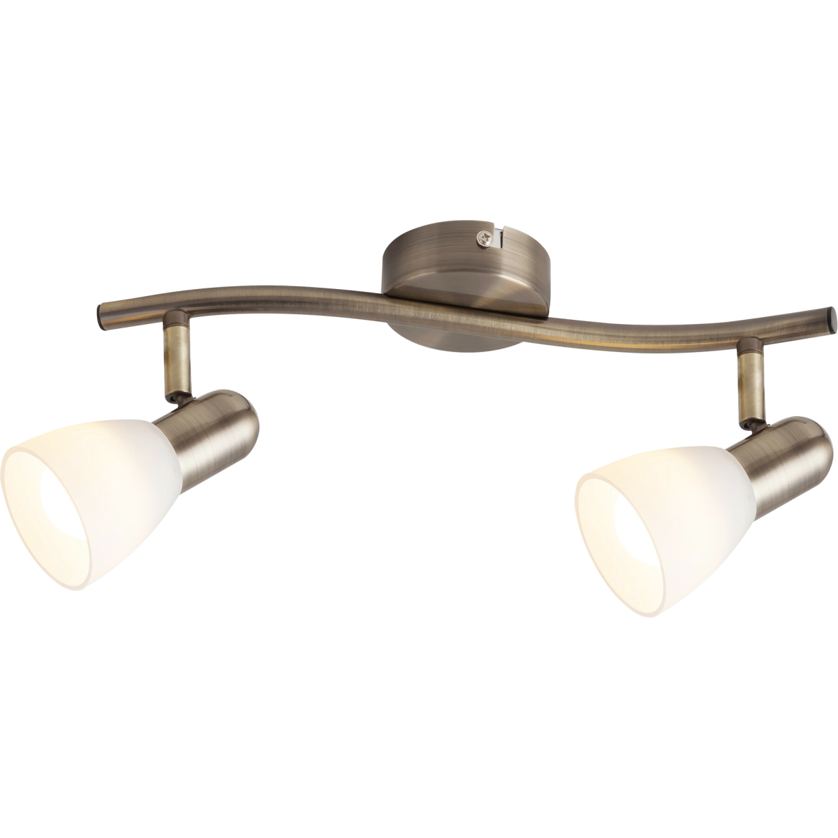 Időtlen stílusú mennyezeti lámpa, 2 darab foglalattal. 35 cm széles, bronz színű fém szerkezet és pozícionálható, fehér színű üvegbúrák, IP20-as védelemmel. A lámpatest E14-es foglalatú, maximum 2x 40W teljesítményű fényforrásokkal működtethető.