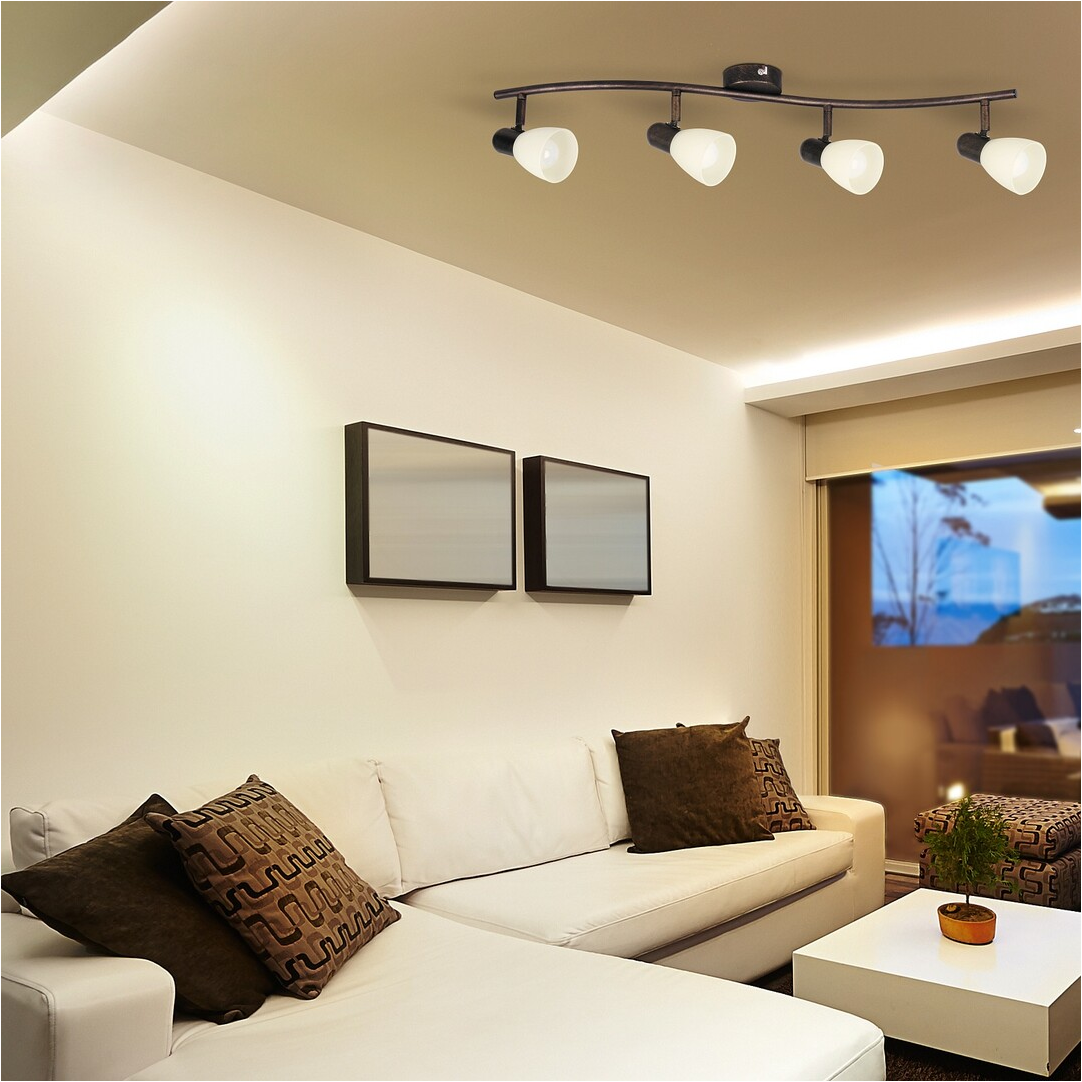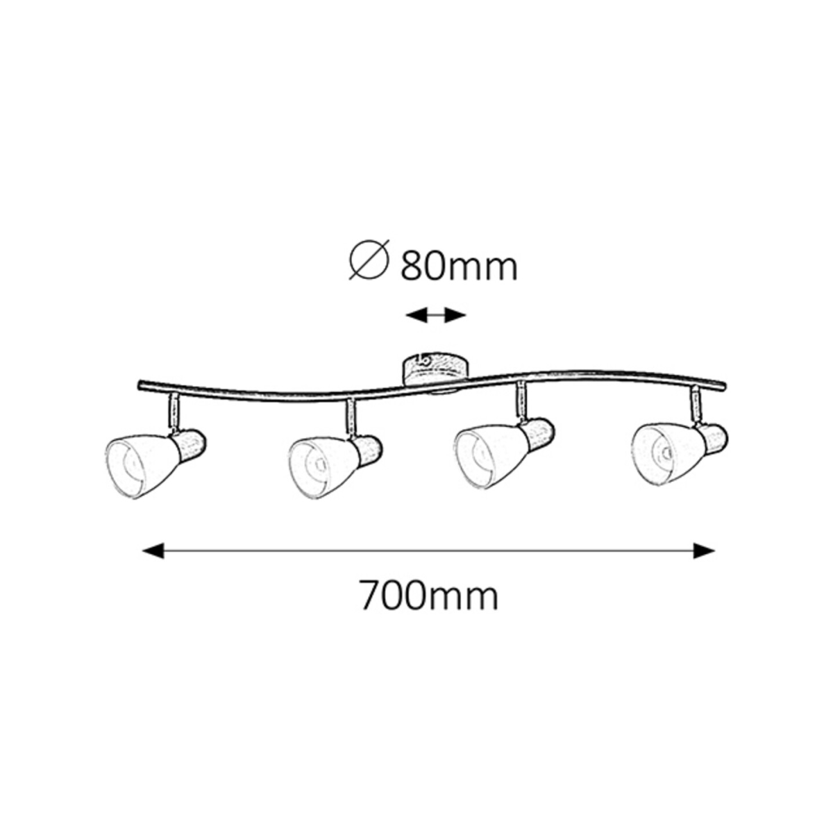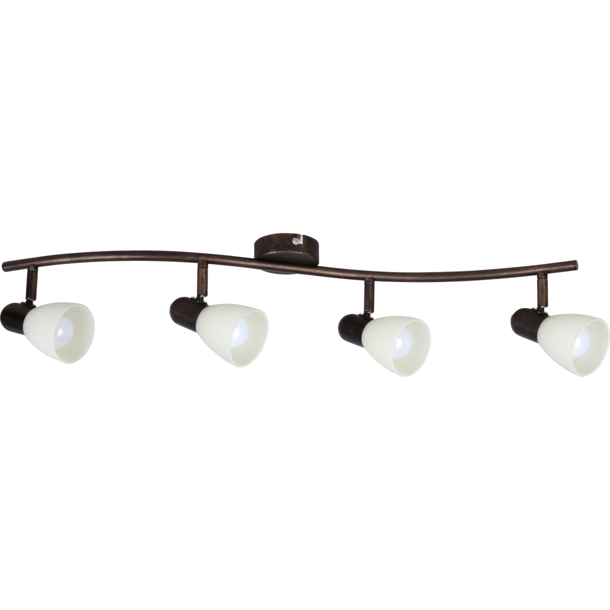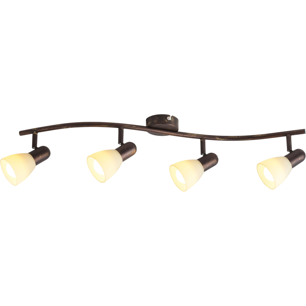 Időtlen stílusú spotlámpa, 4 darab foglalattal. 70 cm széles, antik barna színű fém szerkezet és pozícionálható, krém színű üvegburák, IP20-as védelemmel. A lámpatest E14-es foglalatú, maximum 4x40W teljesítményű fényforrásokkal működtethető.