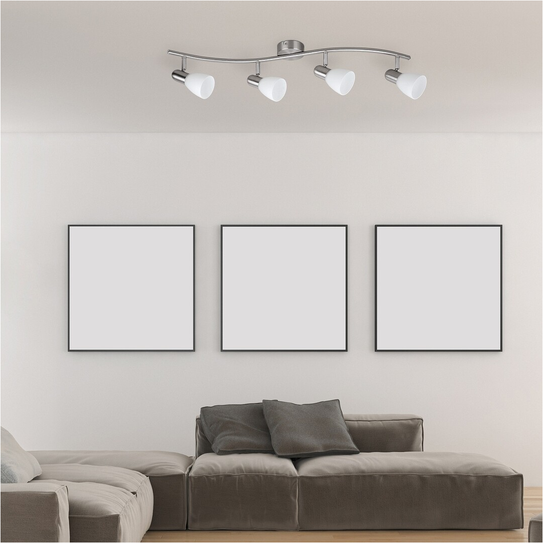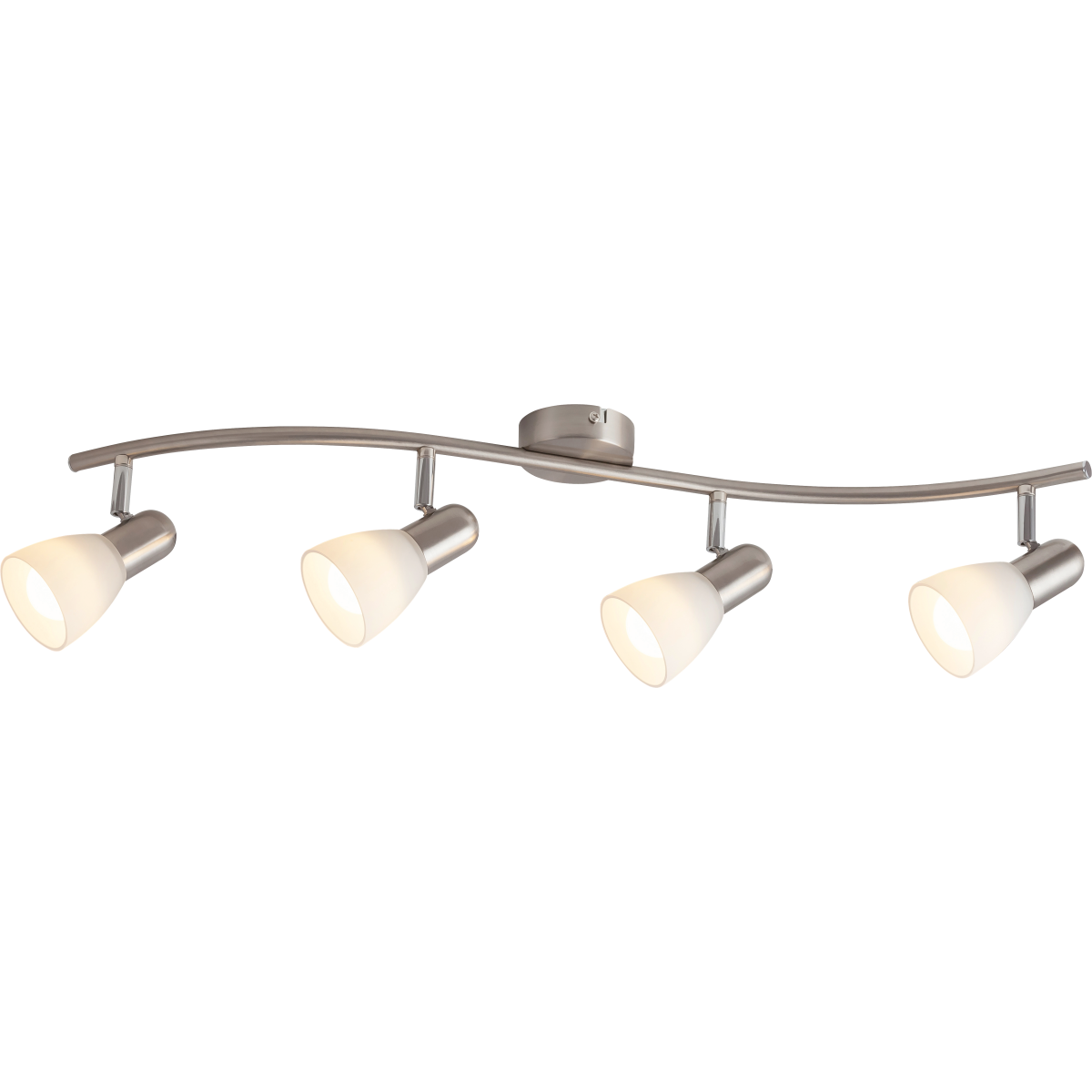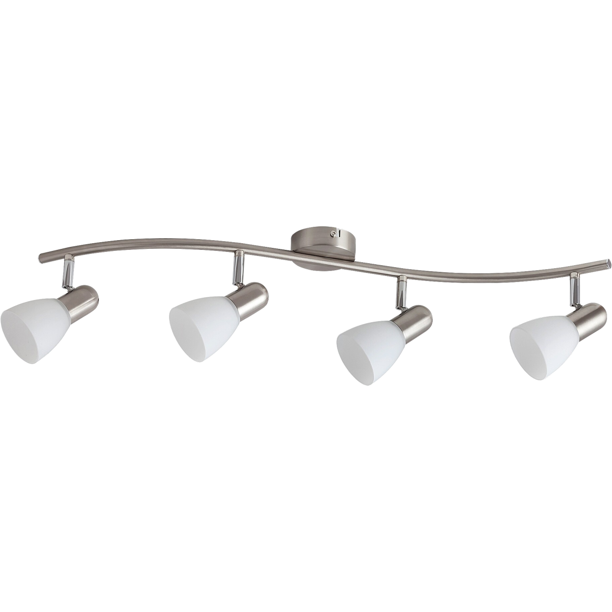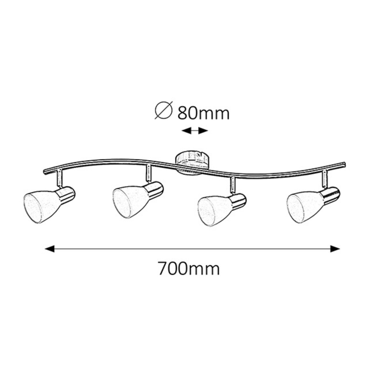 Időtlen stílusú spotlámpa, 4 darab foglalattal. 70 cm széles, szatin króm színű fém szerkezet és pozícionálható, fehér színű üvegburák, IP20-as védelemmel. A lámpatest E14-es foglalatú, maximum 4x40W teljesítményű fényforrásokkal működtethető.