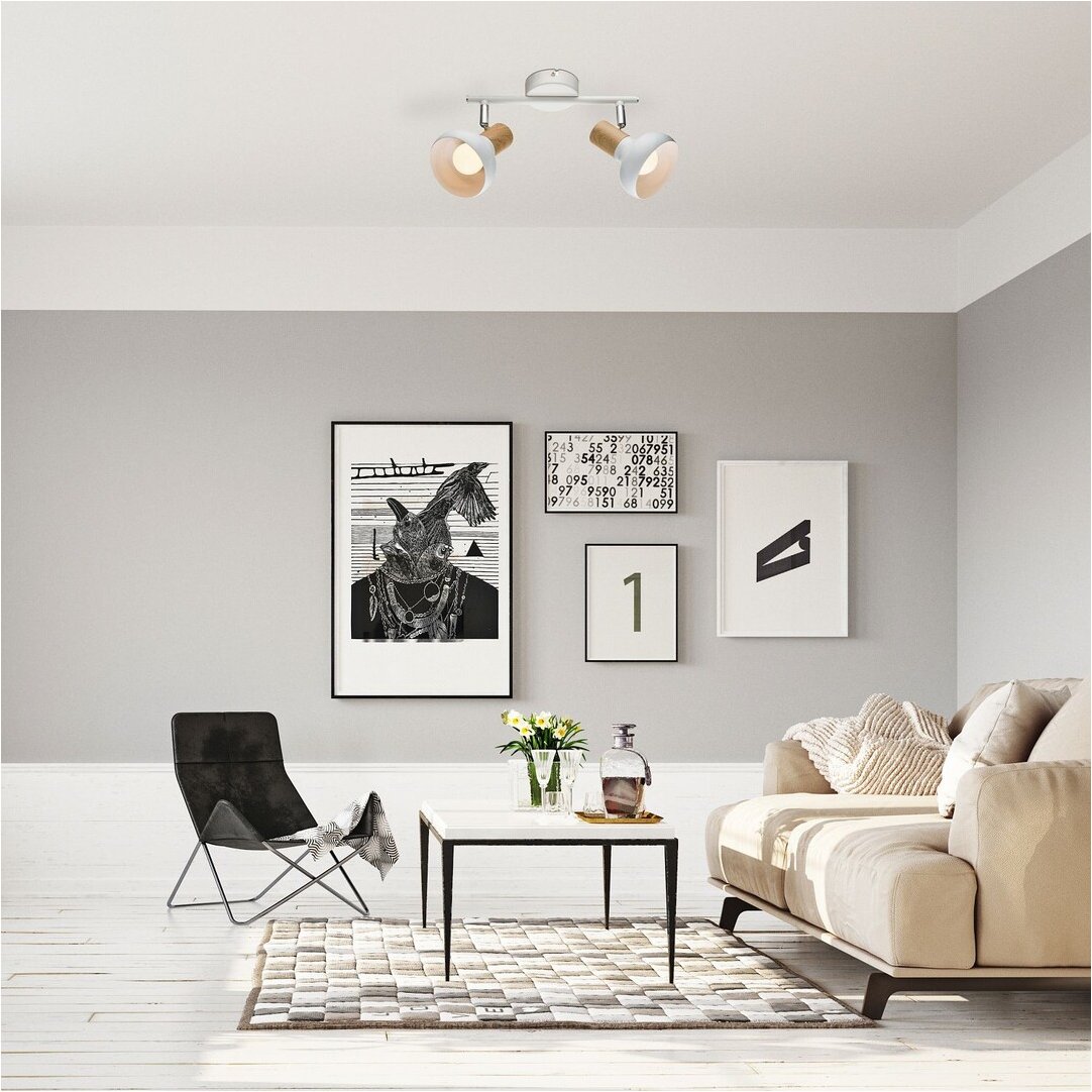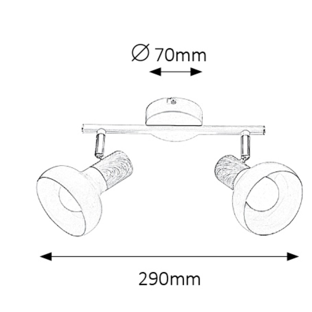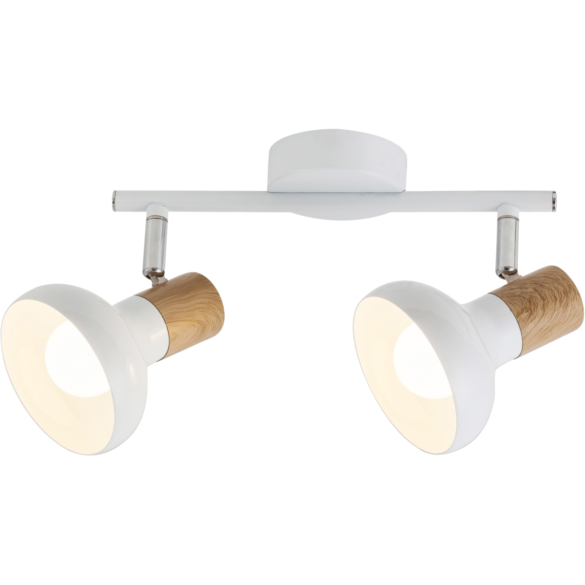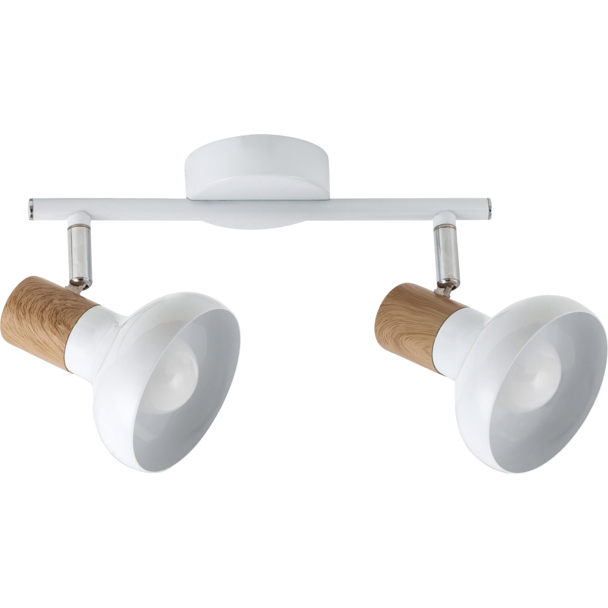 Skandináv stílusú fali vagy mennyezeti spotlámpa 2 db foglalattal. 29 cm széles, fehér és bükk színkombinációjú fém lámpatest pozícionálható lámpaburákkal, IP20-as védettséggel. A lámpatest E14-es foglalatkialakítású, 2x maximum 40W teljesítményű izzókkal használható.