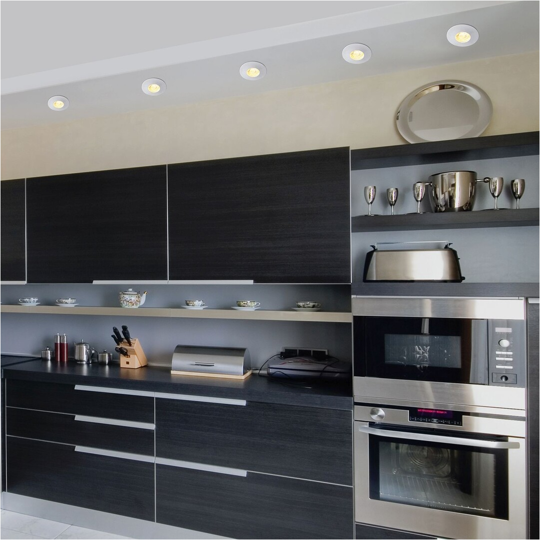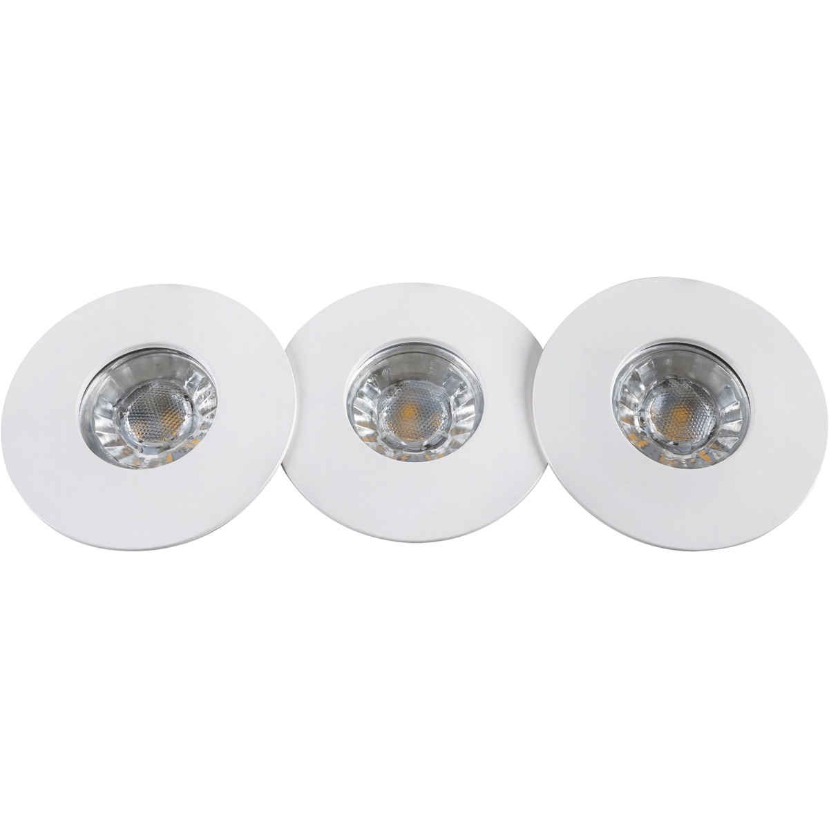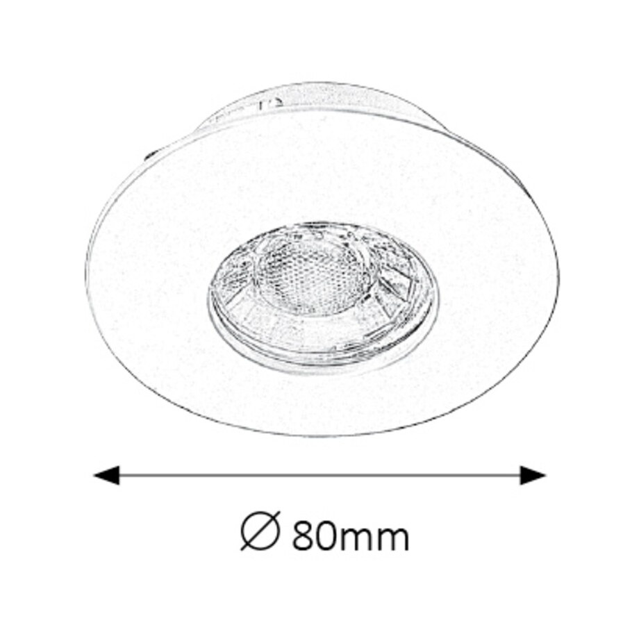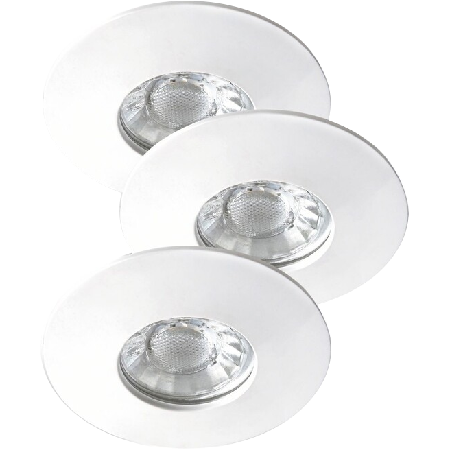 Modern megjelenésű 3 db-os beépíthető spotlámpa szett energiatakarékos LED izzóval. 8 cm átmérőjű, fehér színű fém lámpatest és áttetsző üveg lámpabúra. A falba beépített lámpatest IP20-as, a mennyezetből kilátszó rész IP44-es védettségű. Egy beépített LED izzó teljesítménye 4W, amelyhez 350 lumen fényerő társul. A spotlámpa színhőmérséklete melegfehér (3000 Kelvin).