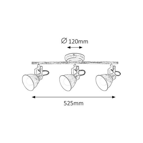 Vintage stílusú mennyezeti spotlámpa 3 db foglalattal. 52,5 cm széles, antik barna színű fém lámpatest és pozícionálható lámpabúrák. A mennyezeti lámpa E14 foglalatú, maximum 3x40W teljesítményű fényforrásokkal használható.