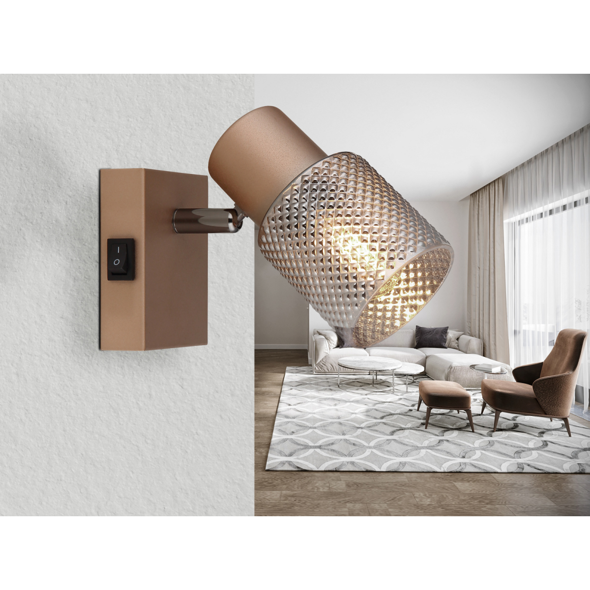 Satella fali lámpa egy sokoldalú reflektor, amely elegáns dizájnjával nyűgöz le. A matt kávészínű fémből készült test fekete krómmal kombinálva modern megjelenést biztosít. A füstszínű üvegből készült kristály hatású hengeres búra eleganciát kölcsönöz, és különleges fényeloszlást hoz létre. A reflektor forgatható és elfordítható, így a fény egyénileg irányítható. A lámpán található praktikus billenőkapcsoló egyszerű és kényelmes kezelést tesz lehetővé.