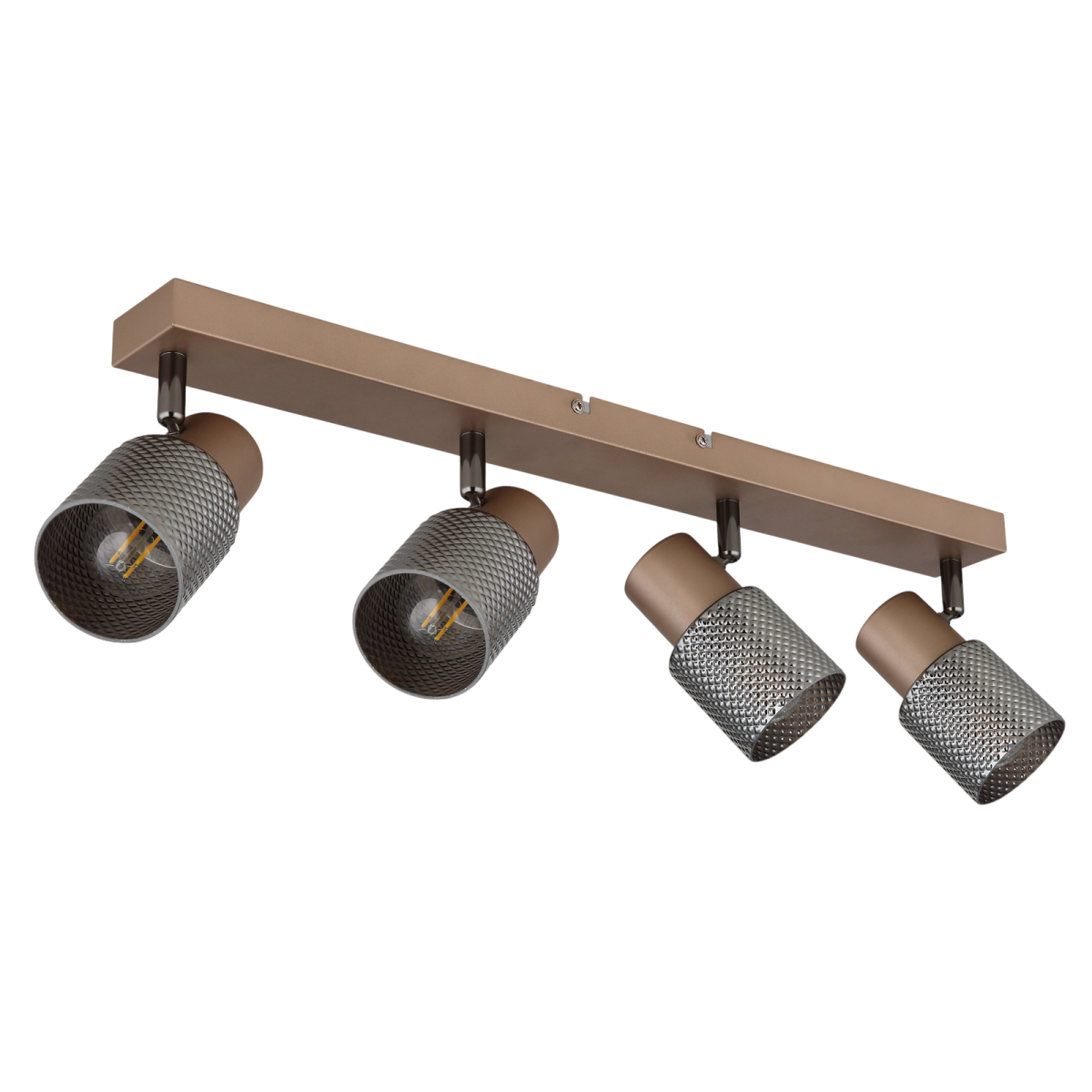 A Satella mennyezeti lámpa lenyűgöz a hosszúkás testével és négy henger alakú búrájával. Forgatható és elfordítható funkciójának köszönhetően a fény egyedileg irányítható bizonyos területek megvilágítására. A kávészínű fémből készült, matt felületű test fekete krómmal kombinálva igényes megjelenést és harmonikus összhatást biztosít. A füstszínű üvegből készült kristály hatású hengeres búrák eleganciát kölcsönöznek, és különleges fényeloszlást hoznak létre. Kellemes légkört teremt akár a nappaliban, a hálószobában vagy az előszobában helyezi el.