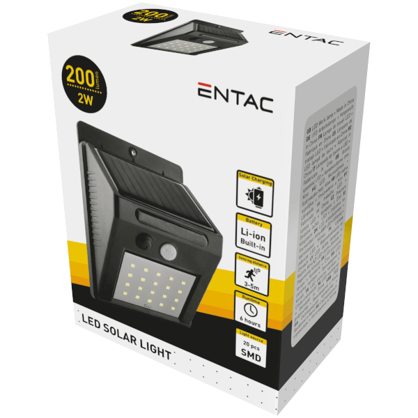 Entac napelemes lámpa 2w 200lm ip65 fény- és mozgásérzékelővel