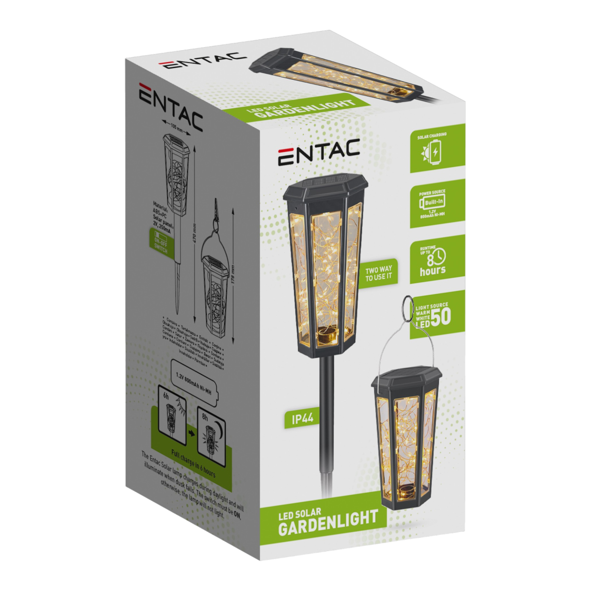 Az Entac leszúrható szolár LED lámpa hatékony, mégis egyszerűen használható kültéri fényforrás kerti utak, növényágyások vagy teraszok megvilágításához. A 0,36 W teljesítményű, melegfehér fényt adó LED 50 lumen fényerőt biztosít, így a lámpa nemcsak dekoratív, hanem funkcionális világítást is nyújt. A beépített napelem nappal automatikusan feltölti a cserélhető akkumulátort, a lámpa pedig sötétedés után önállóan működik. Az IP44-es védelem alkalmassá teszi általános kültéri használatra.