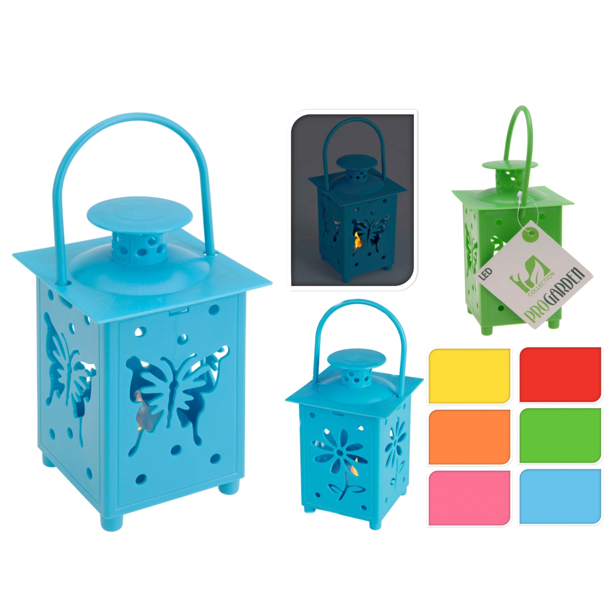 Mintás műanyag lámpás, virág és pillantó mintás. Lámpa 6x6cm + akasztó, ezzel együtt 17 cm. Pislákoló sárga LED-es. Elemmel működik, melyet tartalmaz (1xCR2032). 6 féle színben: piros, kék fukszia, zöld, sárga, narancs.
