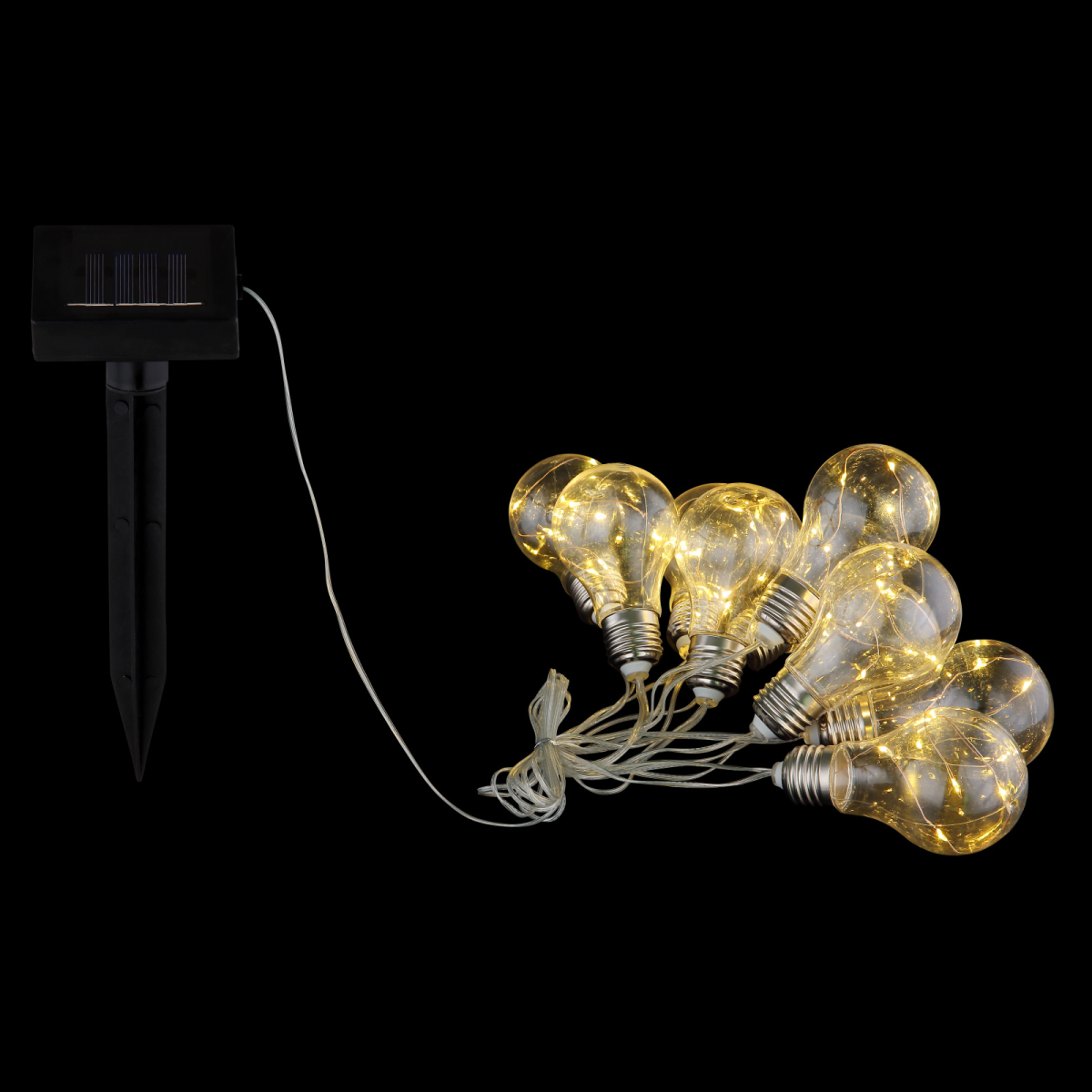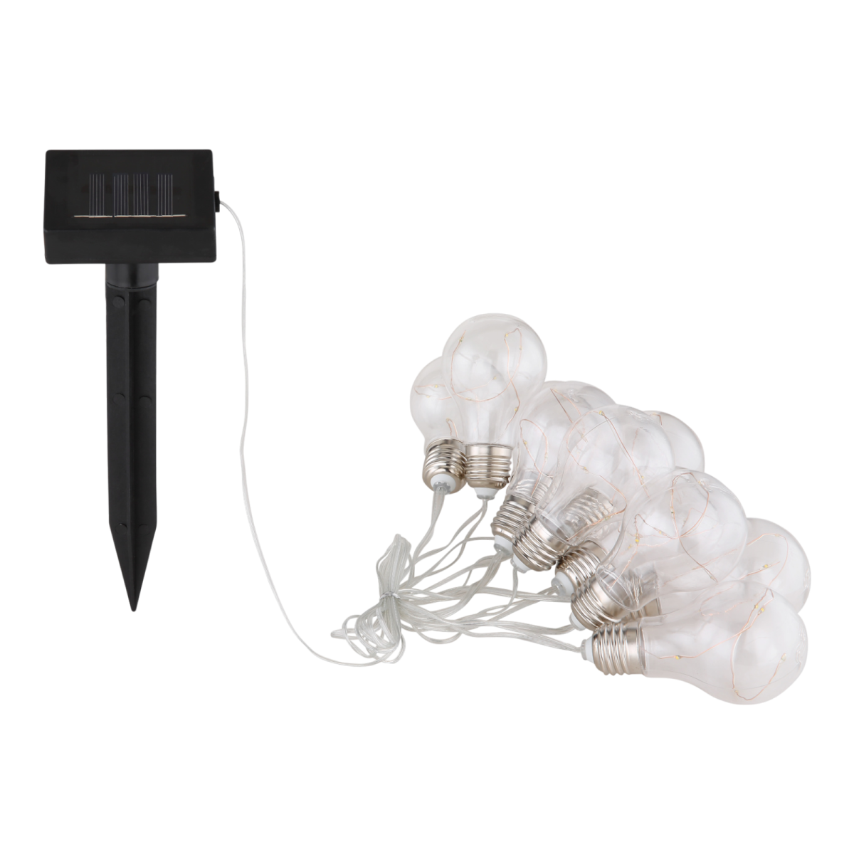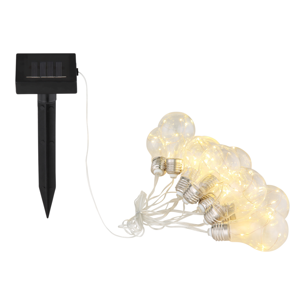 Ez a szolár fényfüzér látványos, izzó formájú LED-ekkel teremti meg a hangulatos esti megvilágítást a kertben, erkélyen vagy teraszon. A 3,8 méter hosszú láncon 10 darab átlátszó búrájú fényforrás kapott helyet, melyeket a beépített napelem tölti fel napközben. A 0,06 W teljesítményű, meleg fényt adó LED-ek kétféle üzemmódban – állandó vagy villogó – használhatók. IP44-es védettsége miatt kültéren is alkalmazható.