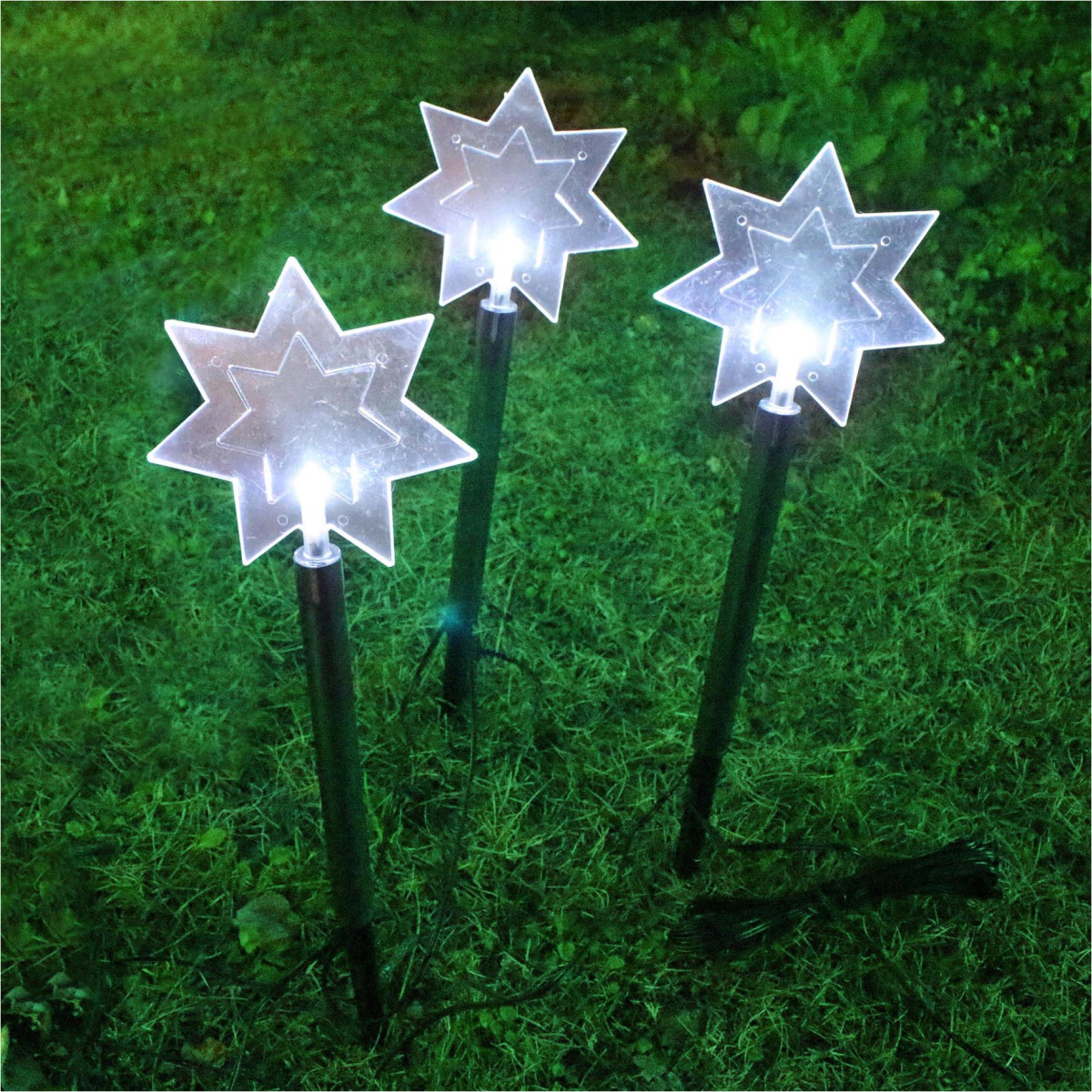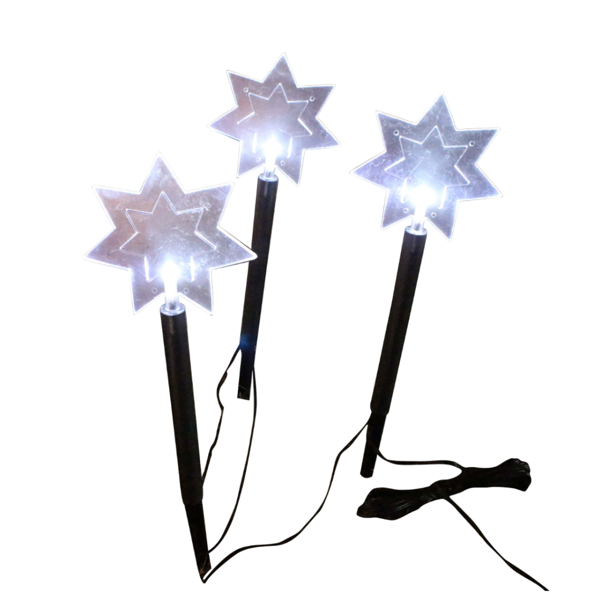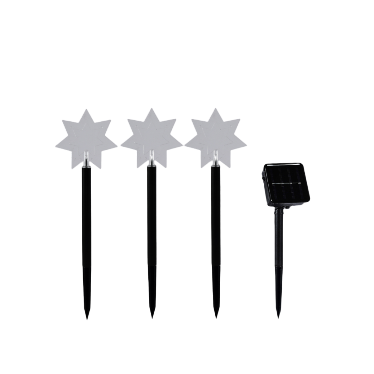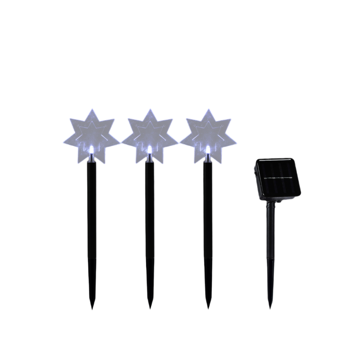 Csillag formájú, leszúrható szolár lámpa 3 db-os kiszerelésben. Teljes magasság: 40 cm, szerkezeti anyagok: műanyag, réz. 1 db 1,2V AA típusú 200 mAh Ni-MH akkuval, fehér fényű LED, kültéri használatra, IP44 védettséggel.