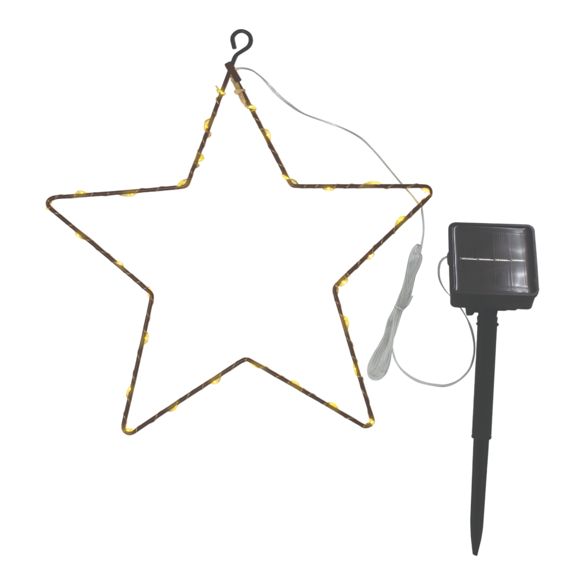 Fémből és műanyagból készült, csillag alakú, függeszthető szolár lámpa, 30 cm méretben, 30 db meleg fehér fényű LED-del, kültéri használatra, IP44 védettséggel, 1 db 1,2 V, AA típusú 600 mAh Ni-MH akkuval.