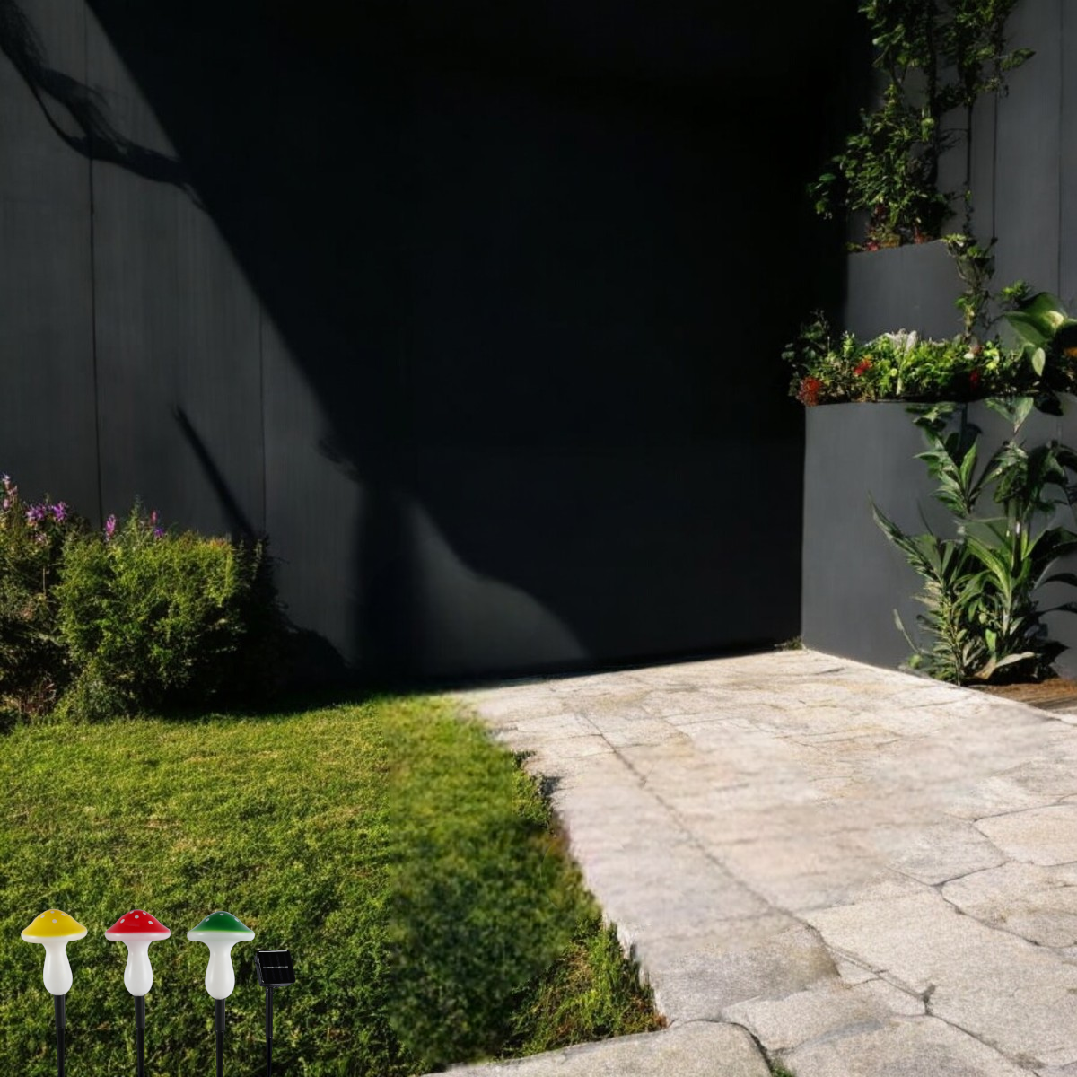 Ez a 3 darabos, gomba formájú leszúrható szolár lámpa vidám, dekoratív megoldást kínál a kert vagy udvar hangulatos megvilágítására.