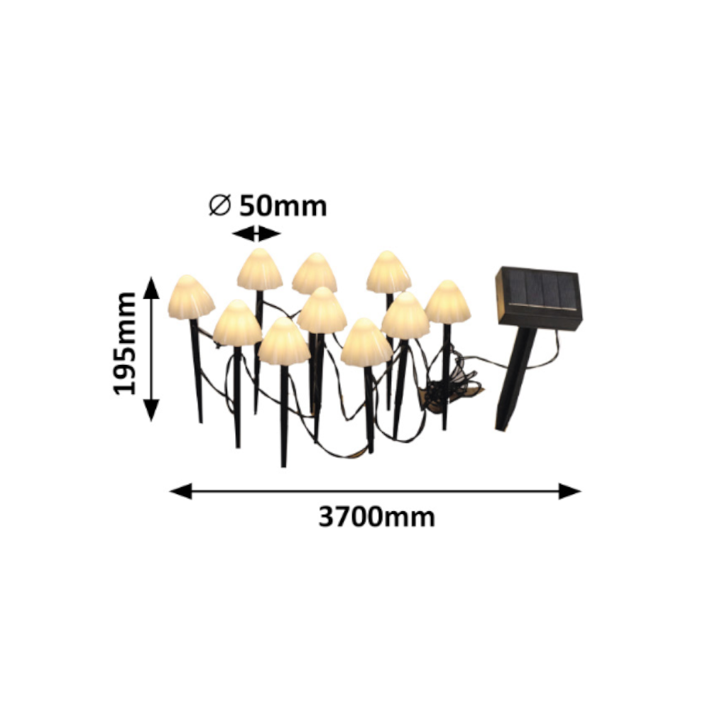 A fekete színben, teljes egészében műanyagból készült modellt a napelemet tartalmazó egységen kívül tíz sorba kötött, gomba formájú fehér búrával ellátott leszúrható lámpa alkotja.