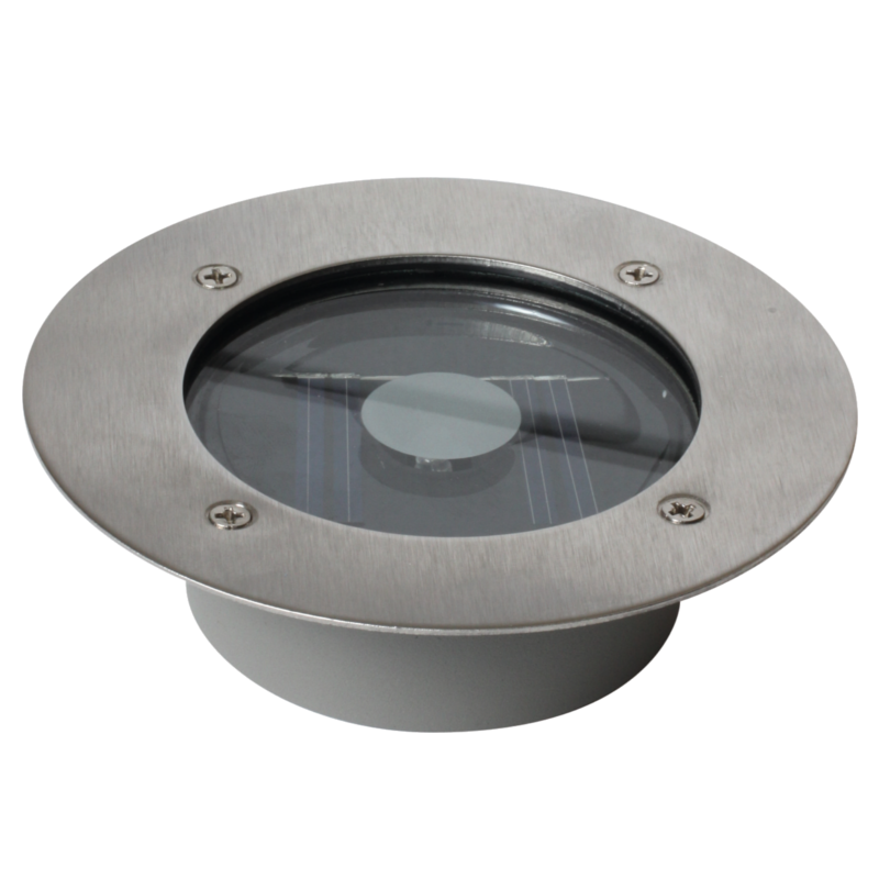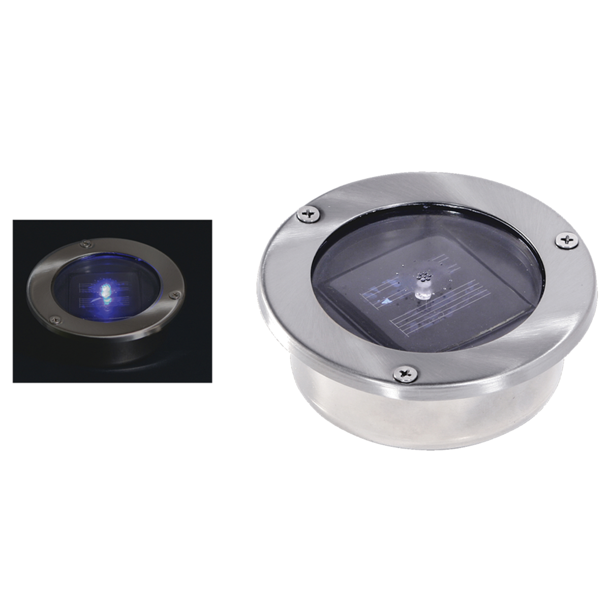 Beépíthető kültéri szolár lámpa. Mérete: 12x4 cm. Fém ház, üveg fedlap vízmentes, időtálló kivitel. 1 db nagy fényerejű LED, beépített napelem és akkumulátortöltő. Cserélhető 1,2V / 250 mAh AAA Ni-Mh akkumulátor.