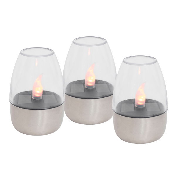 Időjárásnak ellenálló kivitel.1 db melegfehér (narancssárga színű) LED és mécsesláng effektus. Automatikus be- és kikapcsolás. Beépített napelem és akkumulátor töltő: nappal töltődik, éjjel világít. Cserélhető (1,2 V / 100 mAh) AAA akkumulátor. A doboz 3 darab terméket tartalmaz.