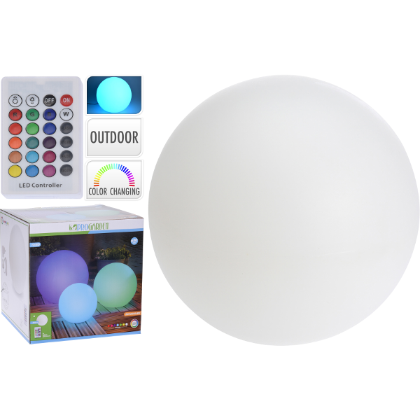 30 cm átmérőjű, gömb alakú szolár led lámpa távirányítóval, adapterrel, 1,8 méter kábellel, IP 44 védettséggel, 16 féle színválasztási lehetőséggel, 24 db LED-del, újratölthető elemmel (3,7V 5200MAH), amely a termék tartozéka: 1xCR2025, anyag: polyethylene.