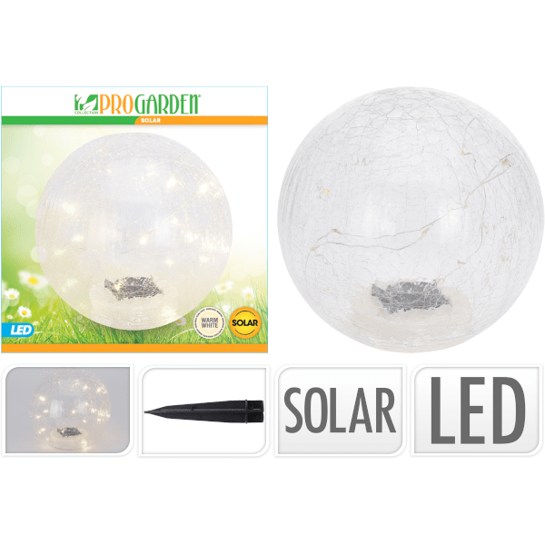 Szolár üveg gömb. Átmérője: 20 cm. 20 meleg fehér mikroled. 1X AA újratöltehető elemmel működik, melyet tartalmaz.