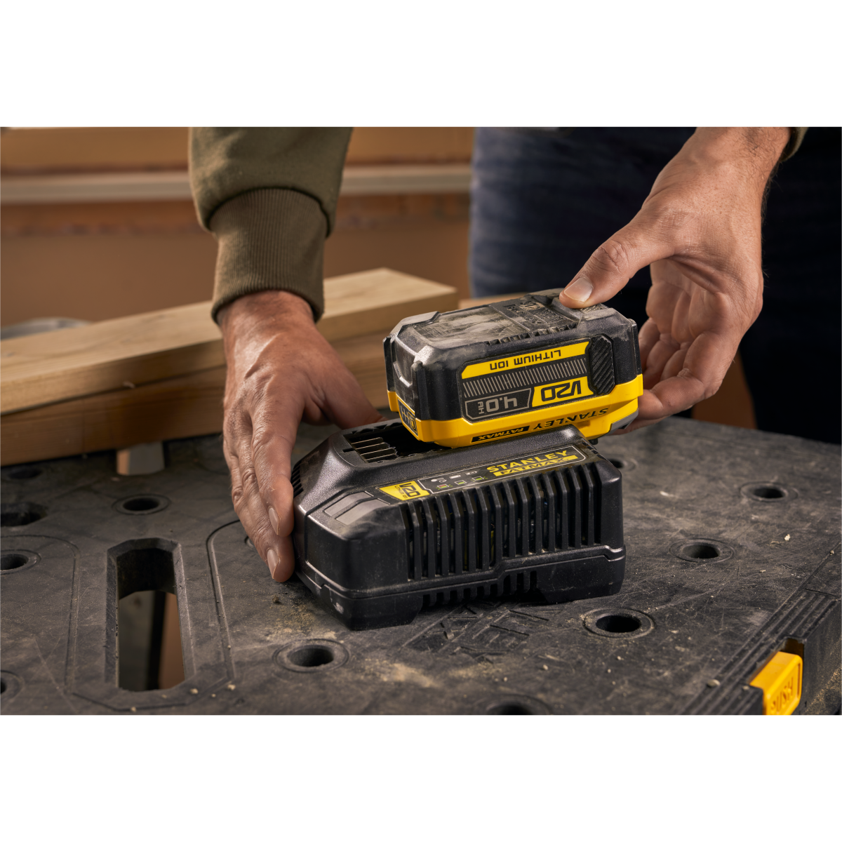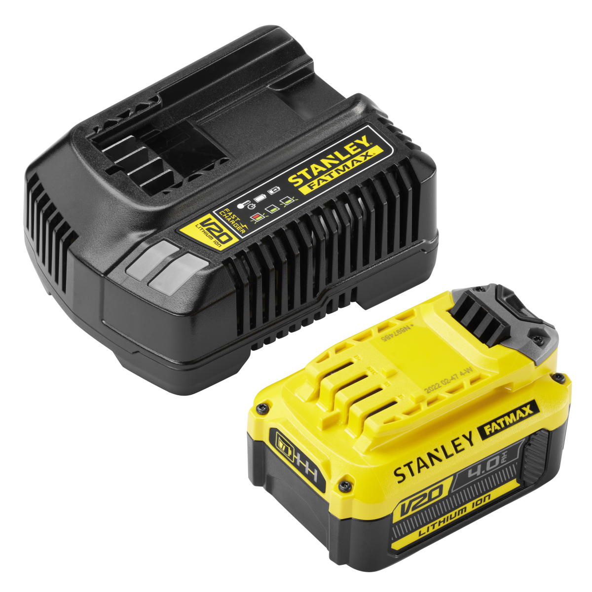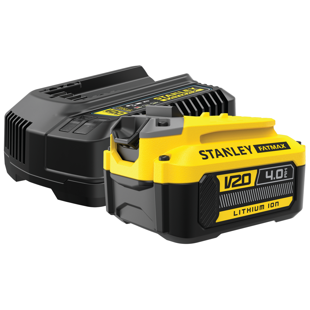 Akkus kezdőkészlet a STANLEY® FATMAX® 18 Volt V20 akkumulátor rendszerhez. 18 V-os 4 amperes gyorstöltő + 4,0 Ah V20 lítium-ion akkumulátor. 4,0 Ah akkumulátorkapacitás a hosszú munkaintervallumokhoz/üzemidőhöz készült. Lítium-ion technológiának köszönhetően nincs önkisülés, nincs memóriaeffektus, mindig használatra kész. Nagy áramerősségű és magas hőmérsékletű professzionális cellák alacsonyabb belső ellenállással a hosszabb működési idő és teljesítmény érdekében. Az akkumulátoron található 3 fokozatú LED-ek lehetővé teszik az akkumulátor töltöttségi állapotának bármikor történő ellenőrzését. A töltő minden STANLEY® FATMAX® 18 voltos V20 lítium-ion akkumulátorhoz használható. LED töltési állapotjelző 4 kijelzési móddal. Robusztus és kompakt ház a hosszú élettartam érdekében. Töltési idő (4,0 Ah Akku): 60 perc; töltő típusa: 4A gyorstöltő.