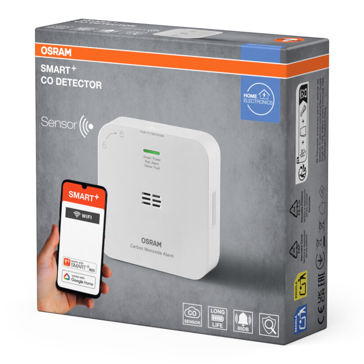 Az Osram Smart+ Wifi szénmonoxid érzékelő megbízható védelmet nyújt a láthatatlan és szagtalan szén-monoxid (CO) ellen. Fejlett elektrokémiai érzékelője már 50 ppm koncentrációtól képes riasztani, így időben figyelmeztet a veszélyre. A hármas riasztási funkció hangos (>85 dB) hangjelzést, villogó piros fényjelzést és az okostelefonodra érkező push értesítést biztosít.
