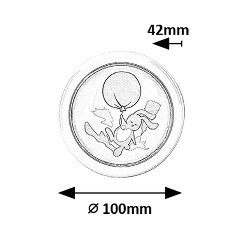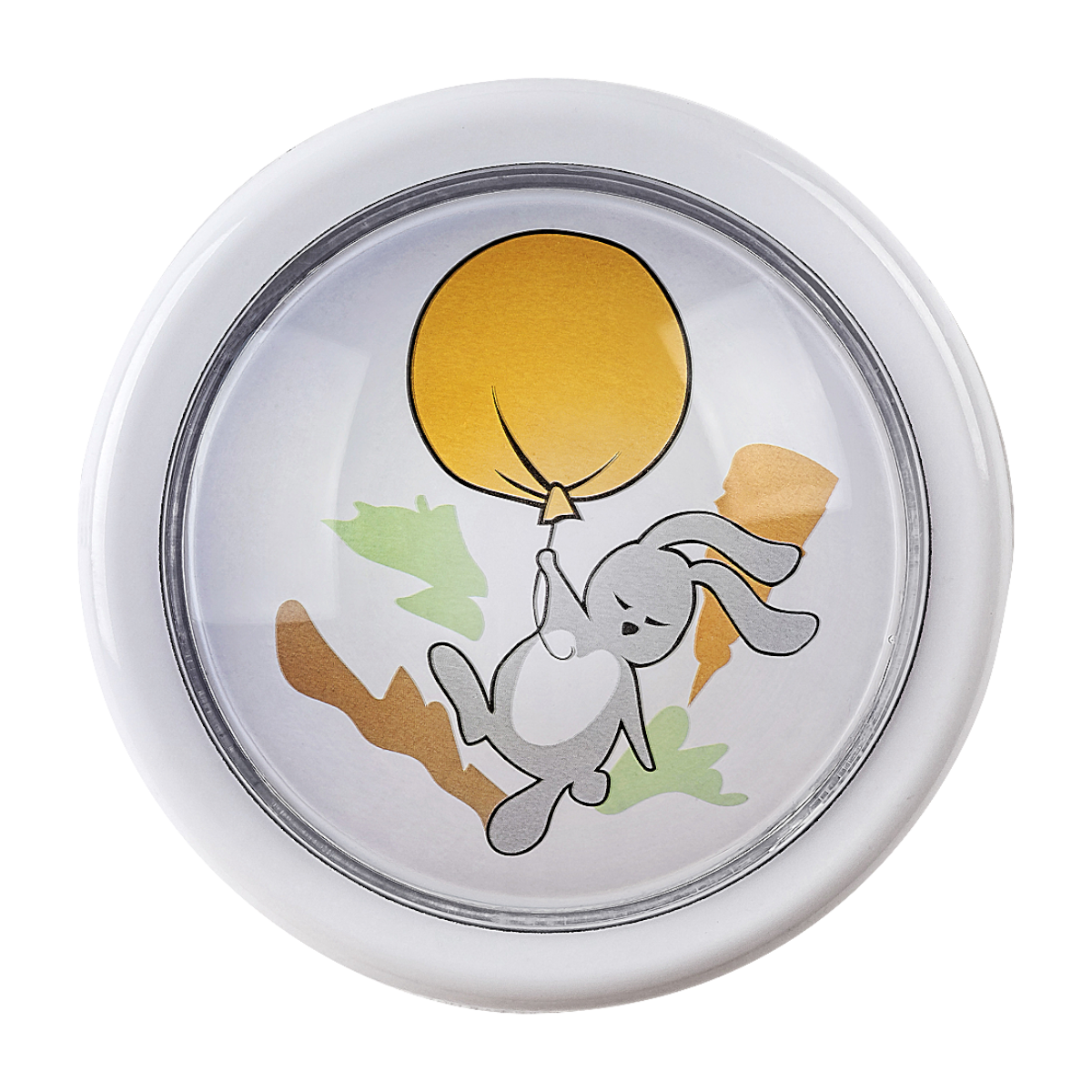 A Rábalux Hopply irányfény kedves és praktikus megoldás a gyerekszobába. A kerek formájú, fehér műanyag lámpát aranyos nyuszis-lufis minta díszíti, amely barátságos, játékos hangulatot teremt. Beépített LED fényforrása 0,3W teljesítménnyel 5 lumen fényáramot biztosít, 6000K hidegfehér színhőmérséklet mellett.