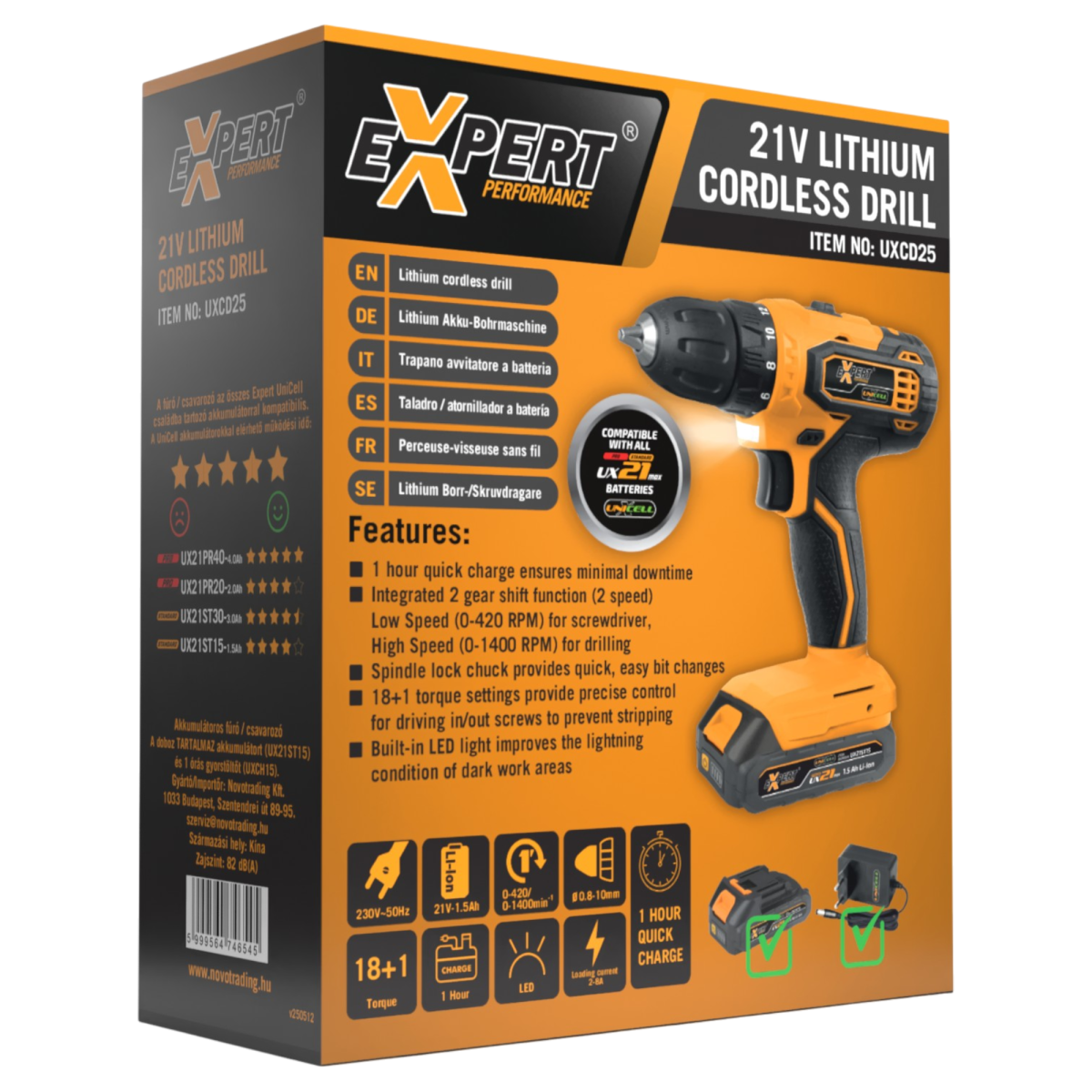 Az Expert UniCell rendszerre épülő akkumulátoros fúró-csavarozó ideális választás otthoni szerelési feladatokhoz, bútorszereléshez, karbantartáshoz vagy barkácsprojektekhez. A géphez egy 1,5 Ah-s akkumulátor és egy 1,5 A gyorstöltő is tartozik, így azonnal használatba vehető. A 2 sebességfokozat és a 18+1 nyomatékbeállítás biztosítja a megfelelő teljesítményt csavarozáshoz és fúráshoz egyaránt. A tokmány tengelyzáras kialakítása és a beépített LED világítás tovább növeli a kényelmet és hatékonyságot.