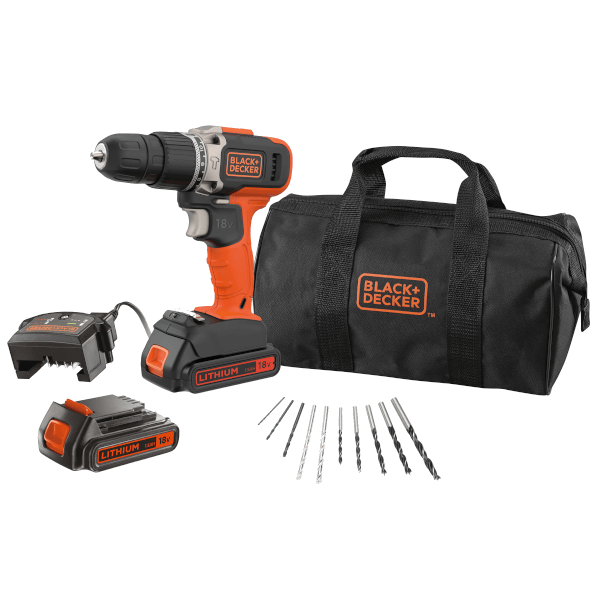 BCD003 18V Li-Ion akkus ütvefúró csavarozó 2 db 1,5Ah akkuval, 400 mA töltővel, 10 db fúrószárral, szövettáskában. A Black+Decker 18V-os rendszerbe illeszthető; a 18V -os rendszer összes terméke ugyanazzal az akkumulátor platformmal működtethető. Két mechanikus sebességfokozat; 10mm-es gyorstokmány; 10 nyomatékállítási fokozat + fúrás + ütvefúrás. LED-es munkalámpa; üresjárati fordulatszám:360/1400 fordulat/ perc; ütésszám: 21000/perc; maximum nyomaték:45 Nm.; furatmélység fába/fémbe/kőzetbe: 25/10/10mm; tartozékok:10db fúrószár. Ipari használatra nem javasolt.