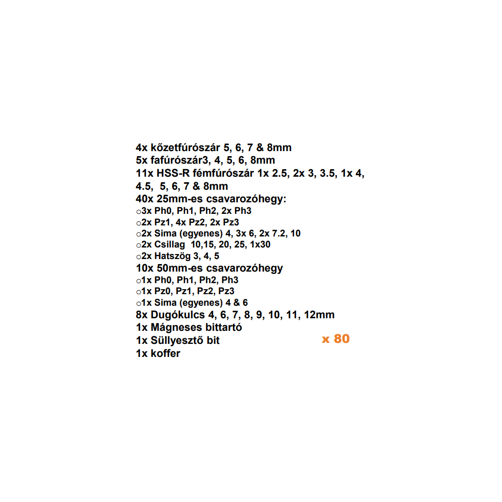 Nyolcvan darabból álló tartozékkészlet, amely a barkácsolási feladatokhoz leggyakrabban szükséges tartozékokat tartalmazza. Sokoldalú, mindenféle fúrási, csavarozási alkalmazáshoz, valamint egyéb barkácsolási és autó-karbantartási munkához.