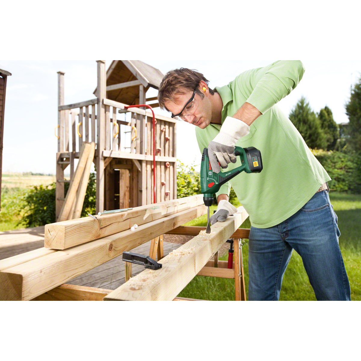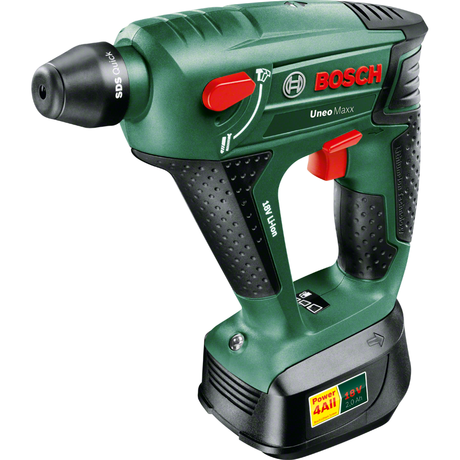 Akkus fúrókalapács Uneo Maxx. Uneo Maxx az erőteljes 3 az 1-ben sokoldalú készülék kalapácsfúráshoz, fúráshoz és csavarozáshoz. Kalapácsfúrás betonban és falban, fúrás és csavarozás erőteljes pneumatikus. Bosch ütőszerkezettel, 0,6 Joule ütéserővel. Kényelmes munkavégzés a különösen kézreálló méretnek, és a csupán 1,4 kg súlynak köszönhetően. Nincs memóriaeffektus, nincs önkisülés: mindig használatra kész a lítium-ionos technológiának köszönhetően. Nagy teljesítményű lítium-ion akku és 1 órás töltőberendezés, a 18 V-os Bosch lítium rendszer minden készülékével használható. Bosch-SDS-Quick rendszerű szerszámbefogás a tartozék gyors és szerszám nélküli cseréje optimális erőátvitellel. Kiegészítő hatlapú szerszámbefogás. Ütéskikapcsolás a fémben és fában végzett fúrásnál, valamint csavarozásnál. Elektronikus Bosch fordulatszám-vezérlés: nyomatékváltás nullától a maximumig nyomókapcsolóval. A cserélhető lítium-ion akkuegységnek különösen hosszú élettartamot biztosít a Bosch elektronikus cellavédelem (ECP).