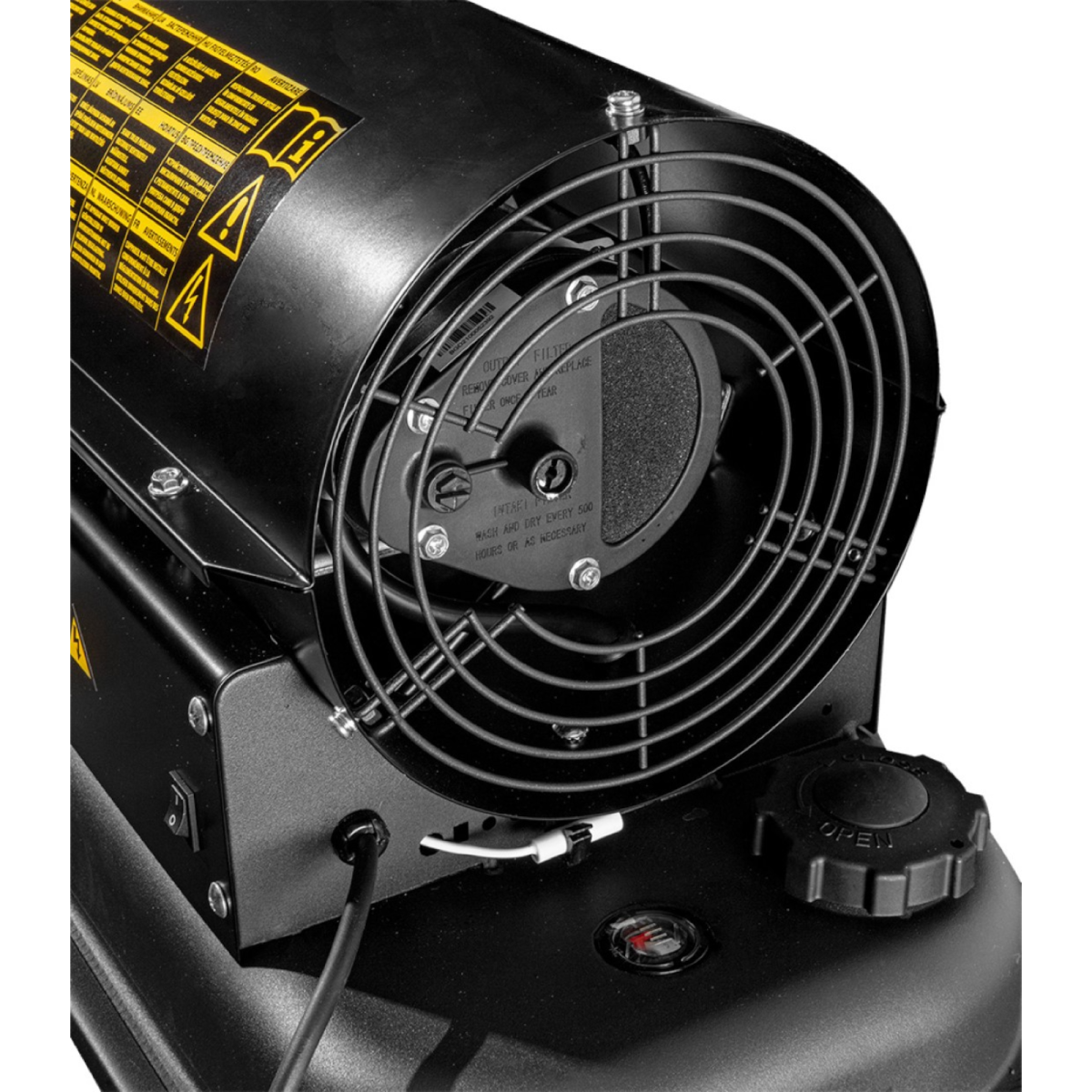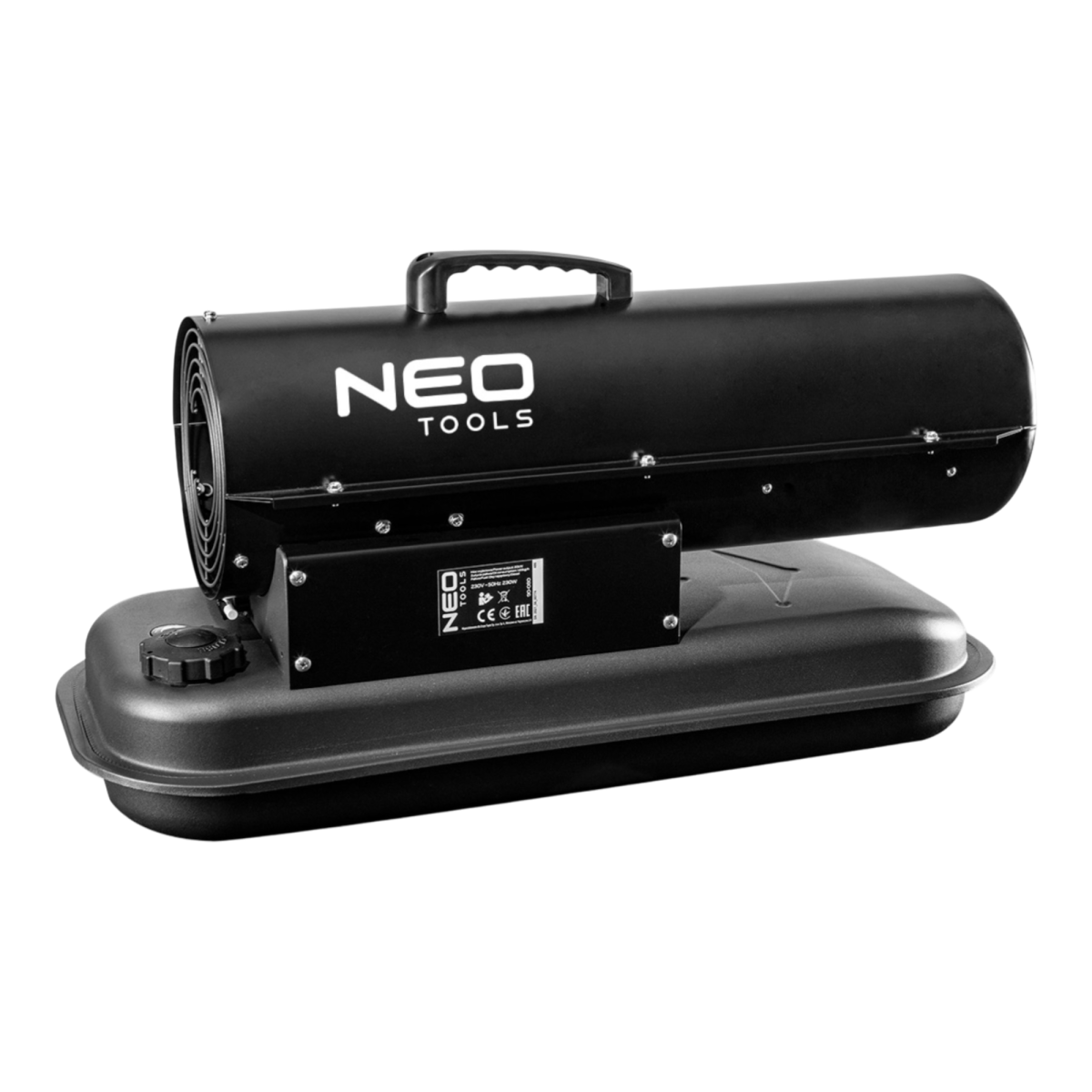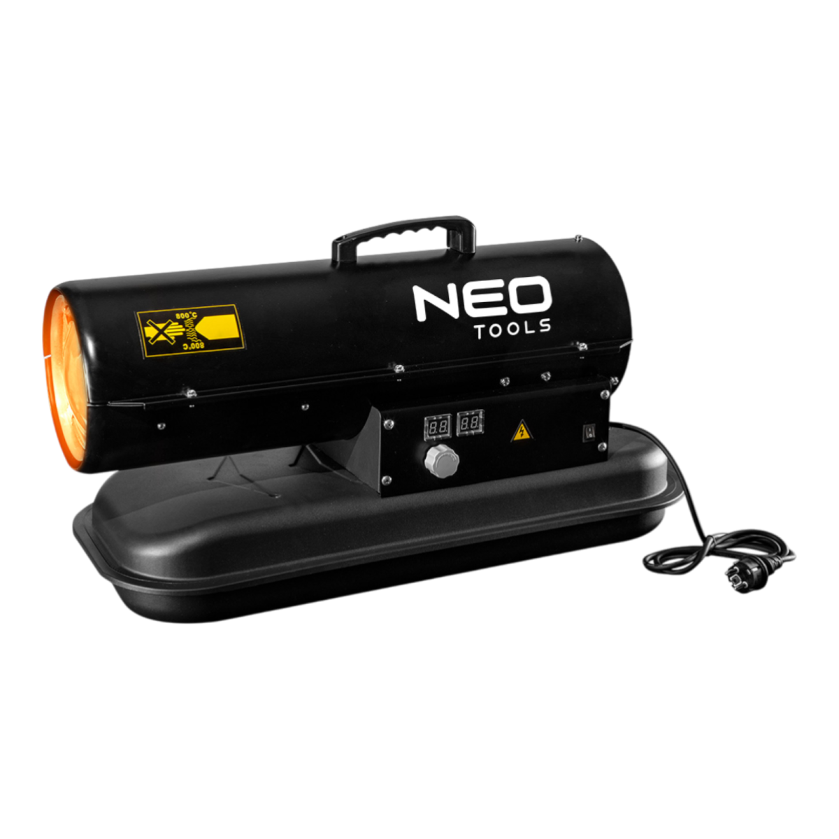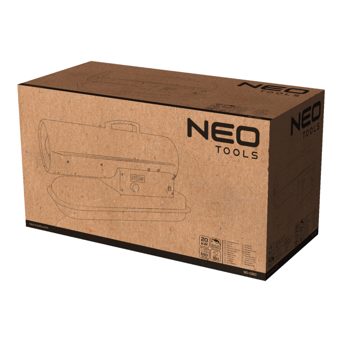 A NEO gázolajos hőlégfúvó (ref. 90-080) 20 kW teljesítményű, hordozható hőforrás, amelyet például csarnokokban, raktárakban, építési területeken stb. használnak fűtésre. Könnyen hordozható kialakításának köszönhetően. A fűtőanyagként gázolaj vagy petróleum használható. A tüzelőtér rozsdamentes acélból készült és ventilátoros hűtéssel rendelkezik. A biztonság érdekében a készüléket lángőrrel látták el, ami lekapcsolja a tápot, ha a tüzelőanyag elfogy. Az olajszintkijelző segítségével könnyen nyomon követhető a tartályban lévő üzemanyag mennyisége. Emellett a hőlégfúvóhoz tartozik egy kézi termosztát is, amely lehetővé teszi a hőmérséklet beállítását és kijelzi az aktuális hőmérsékletet.