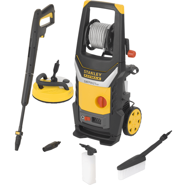 Magasnyomású mosó "stanley fatmax" 2100 w, nyomás: max. 145 bar, vízszállítás: max. 450 l/óra, magasnyomású tömlő: 8 m-es, tartozékok: pisztoly, hosszabító szórószár, állítható szórófej, forgó szórófej, habpermetező, fúvókatisztító csap, átlátszó vízszűrő, kefe. terasztisztítóbubiba: indukciós motor