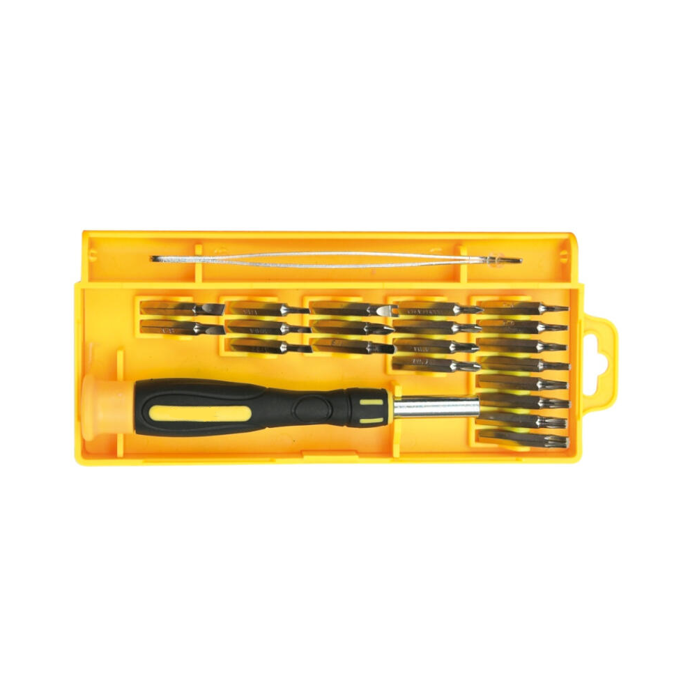 20 részes csavarhúzó készlet; tartalma: PH000, PH00, PH0, PH1, T5, T6, T7, T9, T15, T8, T10, T15, lapos: 1,5mm, 2mm, 2,5mm, 3mm, 4mm, háromszög 3mm, kereszt alakú 3mm, lapos "tárcsa" 2,6, csipesz, adapter.