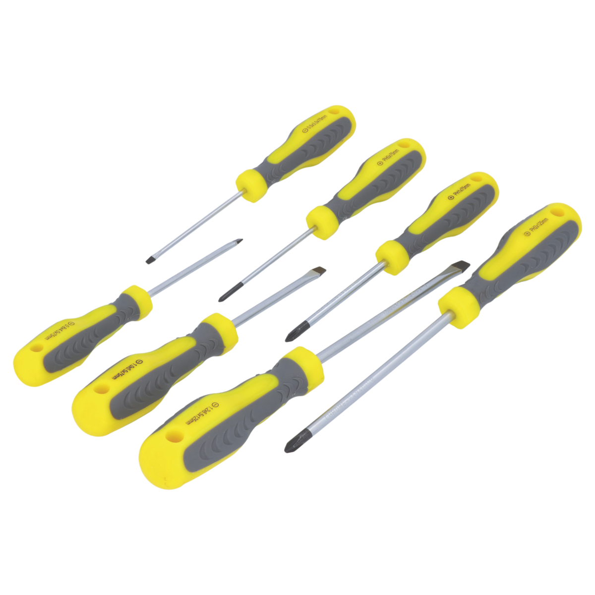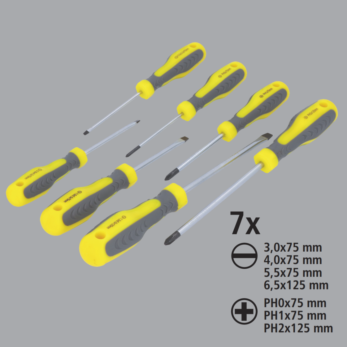 Ez a csavarhúzó készlet 7 db különböző típusú csavarhúzót tartalmaz, amelyek SL, PH és TD hajtású csavarok be- és kicsavarására egyaránt alkalmasak.