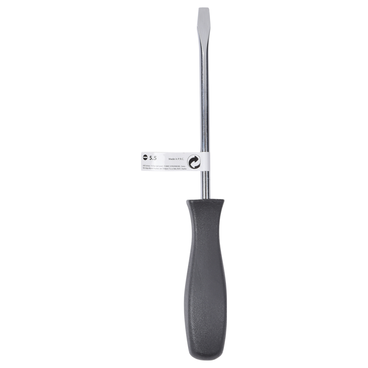 Ez az egyenes, lapos fejű csavarhúzó 5,5 mm széles pengével és 100 mm hosszúságú szárral készül, fekete műanyag nyéllel. A penge szénacélból készült, amely megfelelő merevséget és ellenállást biztosít alapvető szerelési munkák során.
