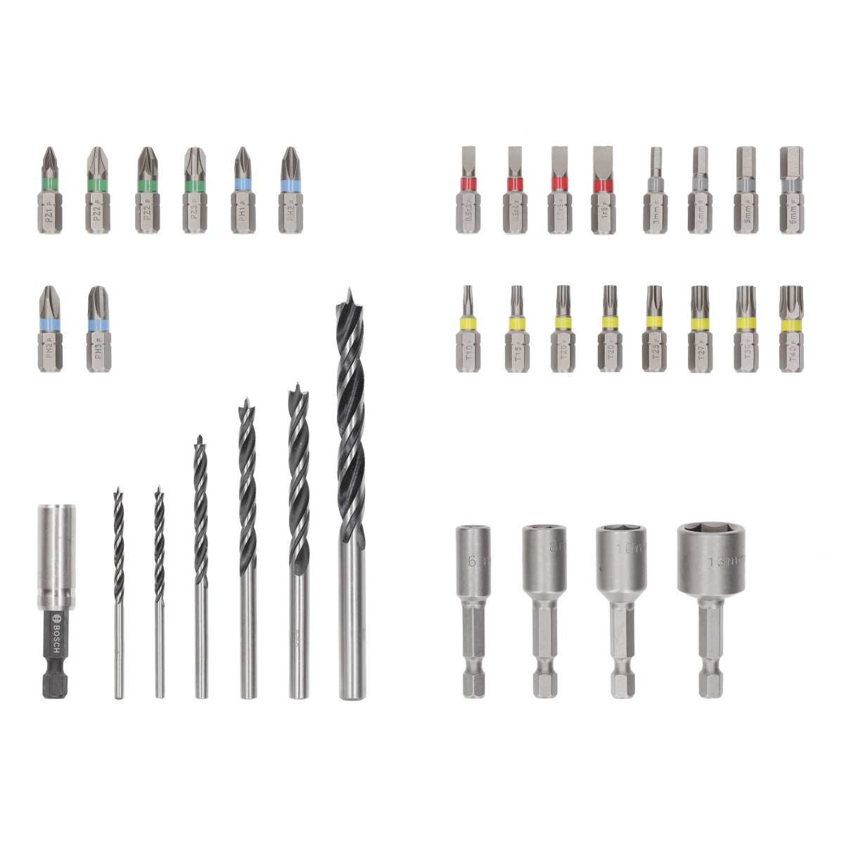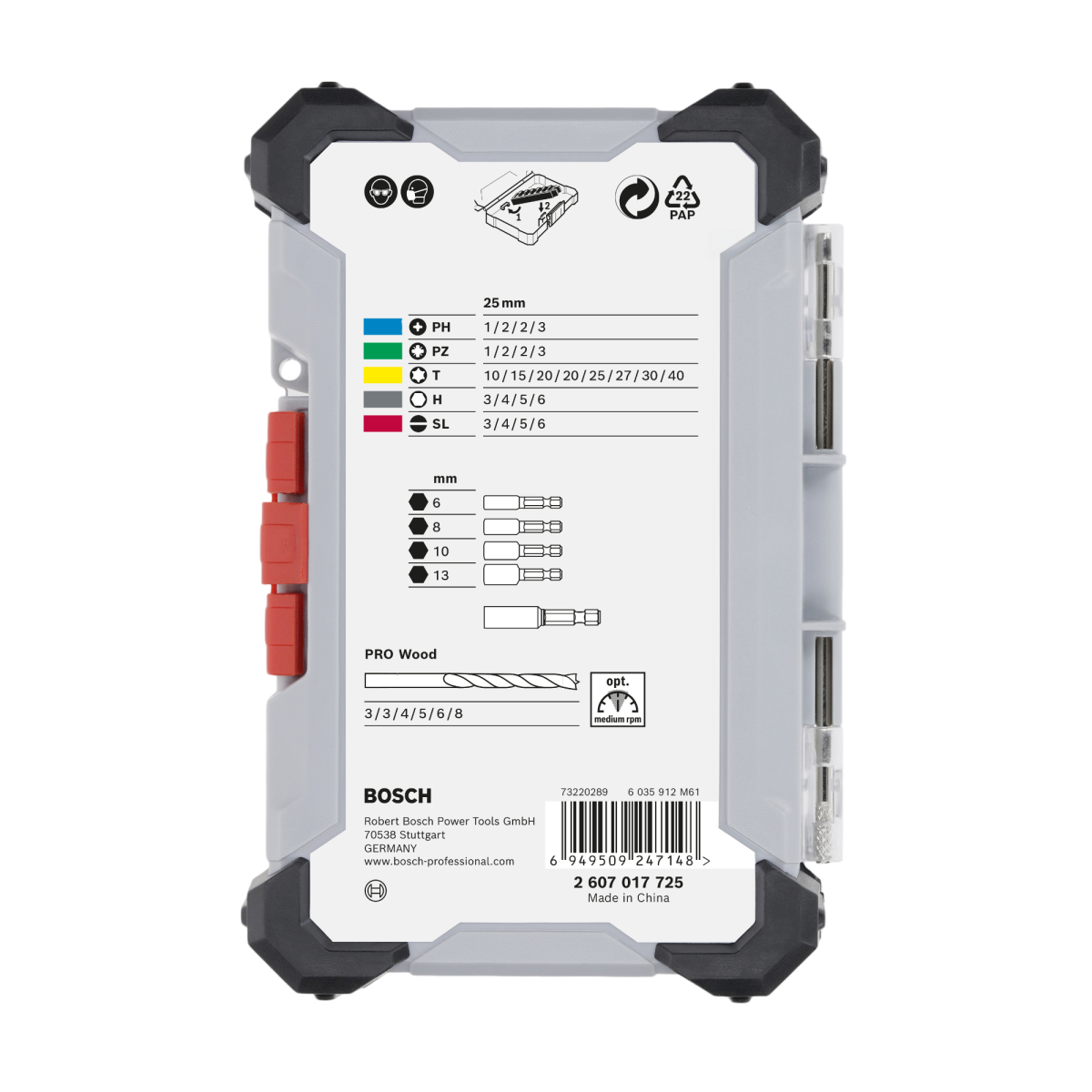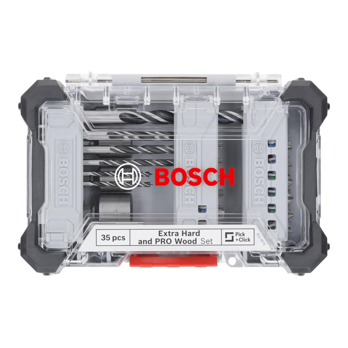 A 35 db-os Extra Hard és PRO Wood készlet tartalmazza az összes alaptartozékot, amelyre szükség lehet a csavarozási feladatok elvégzéséhez, valamint a kemény- és puhafa hatékony fúrásához. A csavarbitek hőkezelt S2, módosított acélból készültek a keménység és a kopásállóság érdekében. Az elemek színkóddal vannak ellátva, így könnyebben kiválasztható a kívánt tartozék. A PRO Wood Brad Point fúrószárak központosító csúccsal (Brad Point) rendelkeznek, amely megakadályozza, hogy elvándoroljanak az új furat indításakor, segítve a precíz fúrást. A készlet robusztus Pick and Click tokban helyezkedik el, amellyel saját eszköztár készíthető, emellett jól szervezetten és védetten tarthatja a csavarbiteket. A csavarbitek 1/4”-es hatszögletű szárral rendelkeznek, hárompofás és hatszögletű fúrótokmányokhoz való használatra. A fúrószárak hengeres, a hárompofás fúrótokmányokkal kompatibilis szárral rendelkeznek.
